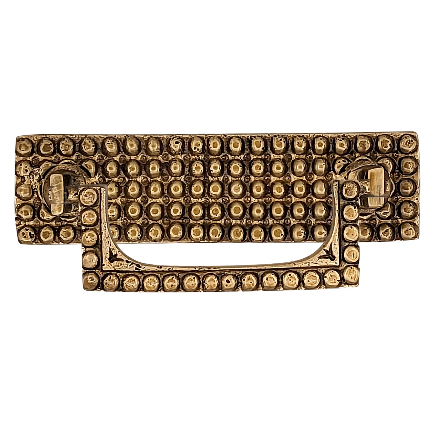 The plate measures 3 3/8 inches long and 7/8 inches tall with a center to center mounting distance is 2 1/2 inches. Hand-finished detailing. This pull handle has a projection of approximately 1 1/2 inches.