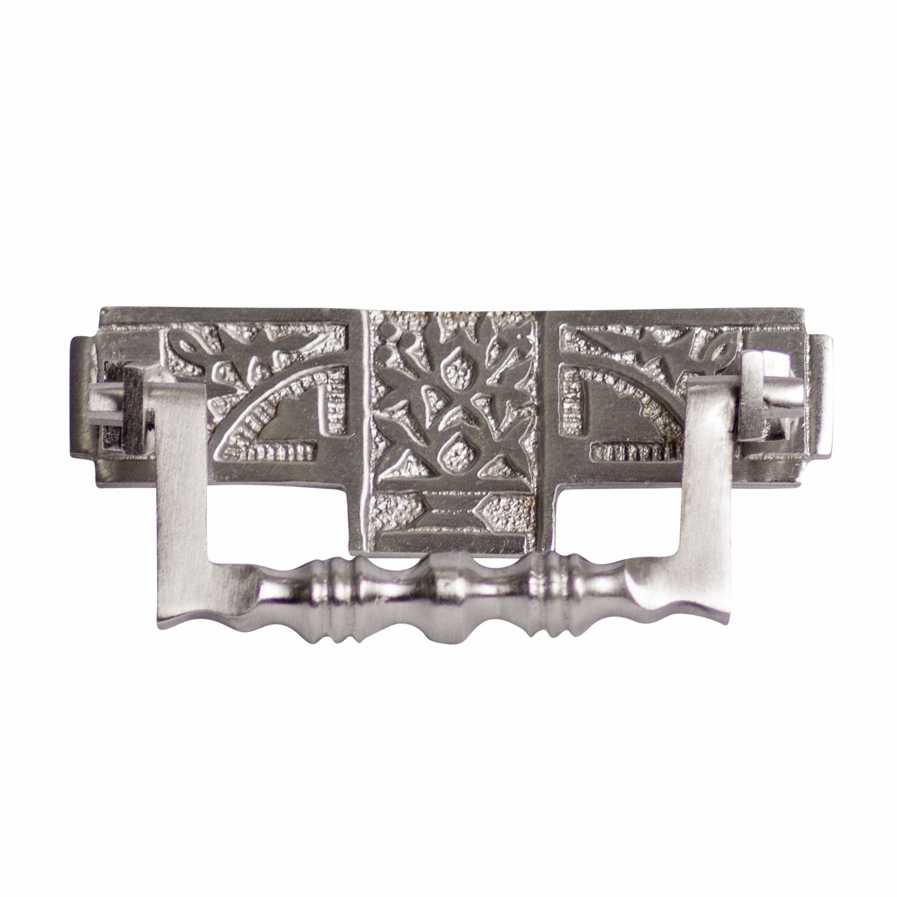 Measures 3 1/2 inches long and 1 1/2 inches tall including drop pull handle. Center to center mounting distance is 2 3/4 inches (2.75 c-c). Highly ornate and hand finished detailing. This product comes as an unlacquered natural brass and it will patina over time. A high strength lacquer coating is available upon request. Available in several finishes, including polished brass, antique brass, Satin Nickel and polished chrome. Comes complete with mounting hardware. The average lead time for this bail pull is approximately 2 to 4 business days.[/description]