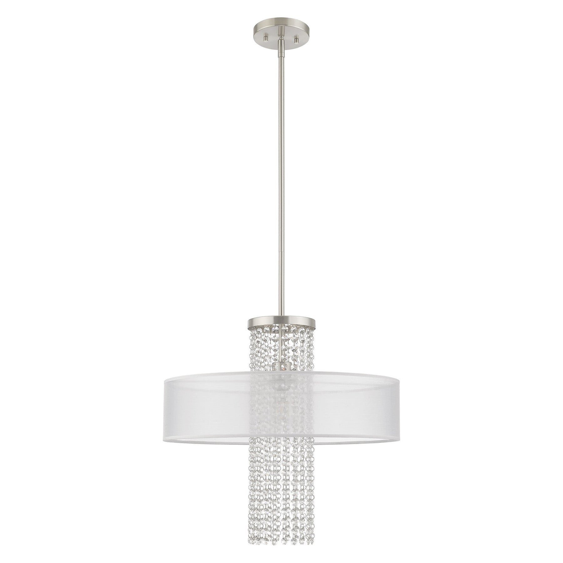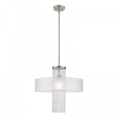 The Bella Vista Pendant Chandelier, item number 41121-91, is a stunning blend of elegance and modernity. This exquisite fixture features a handcrafted translucent fabric shade complemented by a brushed nickel finish and cascading clear crystal strands that create a dazzling waterfall effect. With adjustable height ranging from 27.5 inches to 57.5 inches and a diameter of 20 inches, it is designed to accommodate sloped ceilings. It utilizes one medium base bulb with a maximum wattage of 100W (bulb not included) and comes with 8 feet of wire along with interchangeable stem sections of 6, 12, and 18 inches for customization. This chandelier is suitable for damp locations, making it a versatile choice for various settings.