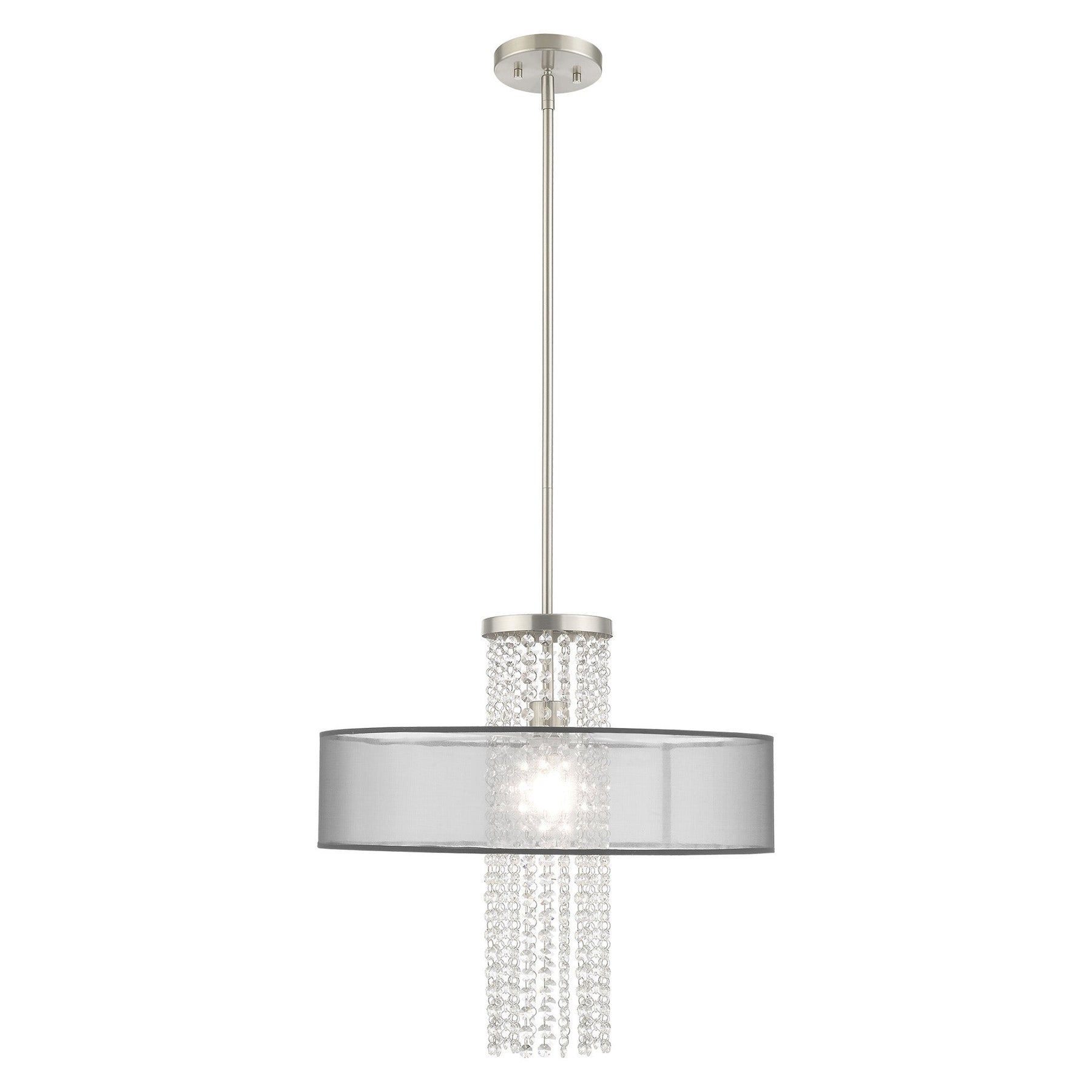 The Bella Vista Pendant Chandelier (Item number: 43204-91) is a stunning addition for those desiring a blend of modern elegance and traditional design. This fixture features a handcrafted translucent black fabric shade adorned with clear crystals, suspended from a brushed nickel finish. With an adjustable height ranging from 27.5 to 57.5 inches and a diameter of 20 inches, it accommodates various ceiling heights while delivering a glamorous lighting effect. The chandelier requires one medium base bulb with a maximum wattage of 100W (bulb not included) and comes with 8 feet of wire. It is suitable for damp locations, enhancing its versatility for various settings. The chandelier also accommodates sloped ceilings and includes additional stem sections of 6