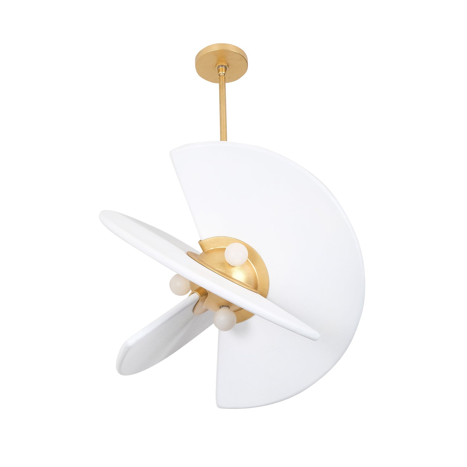 Inspired by the graceful dance of three plains encircling a central light source, with solid wood blades tapering to accentuate the main light focus. Crafted from a harmonious blend of steel and wood, it showcases impeccable metal working craftsmanship, creating visually intriguing sections of light that bounces off the surrounding planes, all elegantly presented in a Bright Gold and Matte White finish