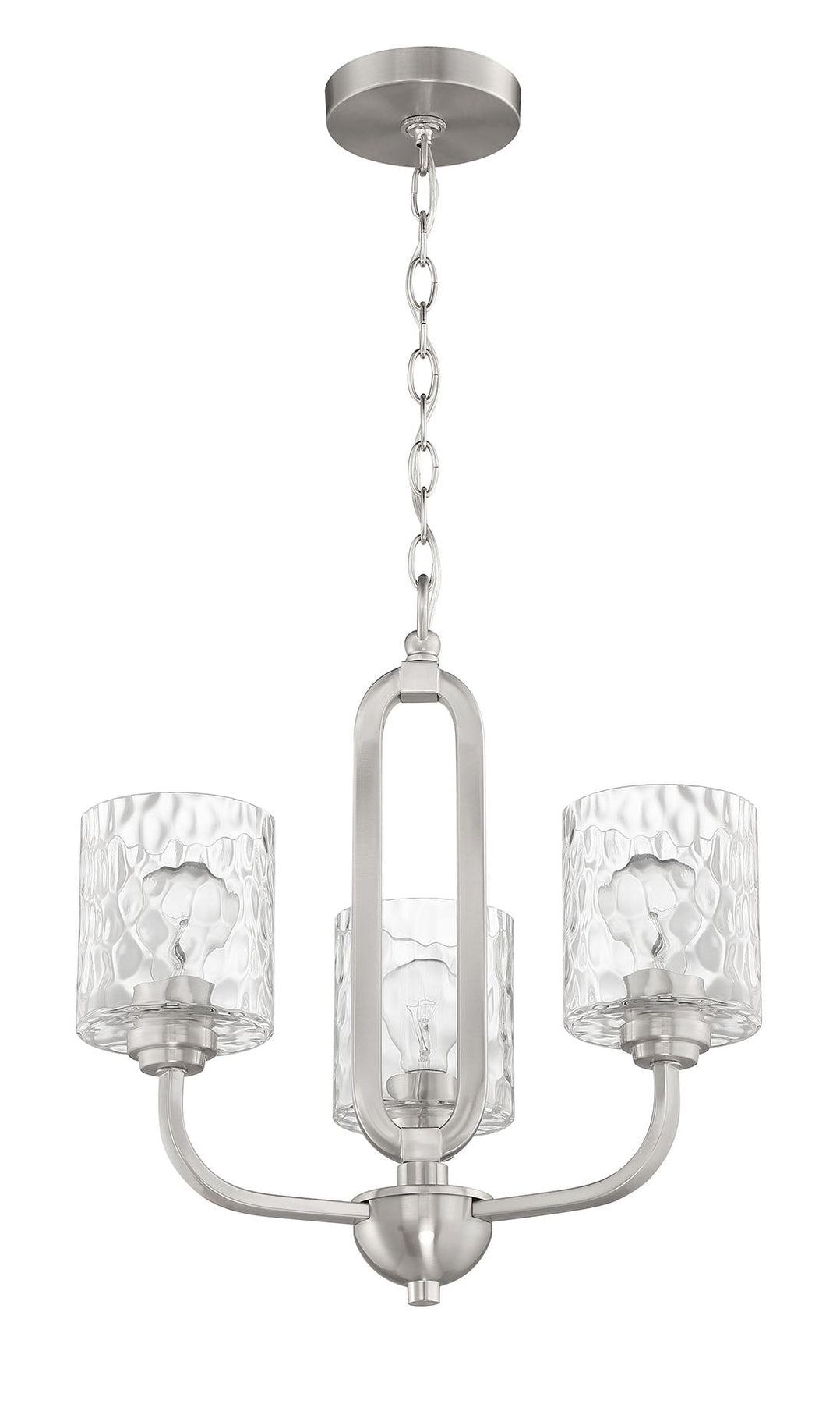 The Collins 3 Light Chandelier in Brushed Polished Nickel is an exquisite addition to any indoor space, showcasing elegant geometric elements that beautifully highlight its clear hammered glass shades. This chandelier requires three medium base 60 watt bulbs (not included) and features a mounting method that includes a 6FT chain for versatile installation. With dimensions of 17.50 inches in depth and width, and a height of 18.75 inches, it is designed to create a warm, inviting ambiance. The chandelier also boasts a 1-year limited warranty and is cULus listed for safety.