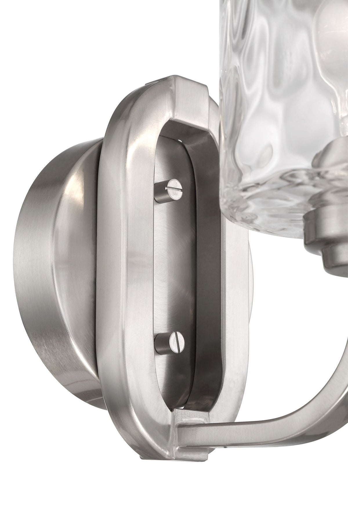 The Collins 1 Light Wall Sconce in Brushed Polished Nickel is a striking addition to any indoor space, featuring elegant geometric shapes that enhance its aesthetic appeal. This sconce is designed for wall mounting and requires one medium base 60 watt bulb (not included). With dimensions of 5.13 inches in width and depth, 9.13 inches in height, and an 8-inch extension, it fits perfectly in various locations. Rated for damp locations, it is both functional and stylish, illuminated through its clear hammered glass shade.