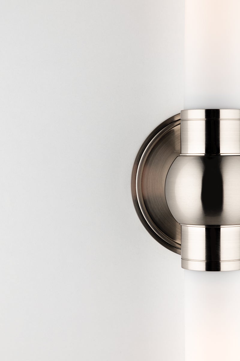 The Cornwall Wall Sconce by Hudson Valley Lighting features a sleek and sophisticated design, perfect for enhancing your living space. Measuring 5.00 inches in width and 25.50 inches in height, with an extension of 4.50 inches, this sconce is equipped to accommodate two E26 medium base bulbs, each with a maximum wattage of 75W (bulbs not included). The stunning opal matte glass shade casts a soft, inviting glow, while the fixture offers a variety of finish options including Aged Brass, Polished Chrome, Polished Nickel, and Satin Nickel. With a UL Damp rating, it is suitable for use in bathrooms and other humid environments.