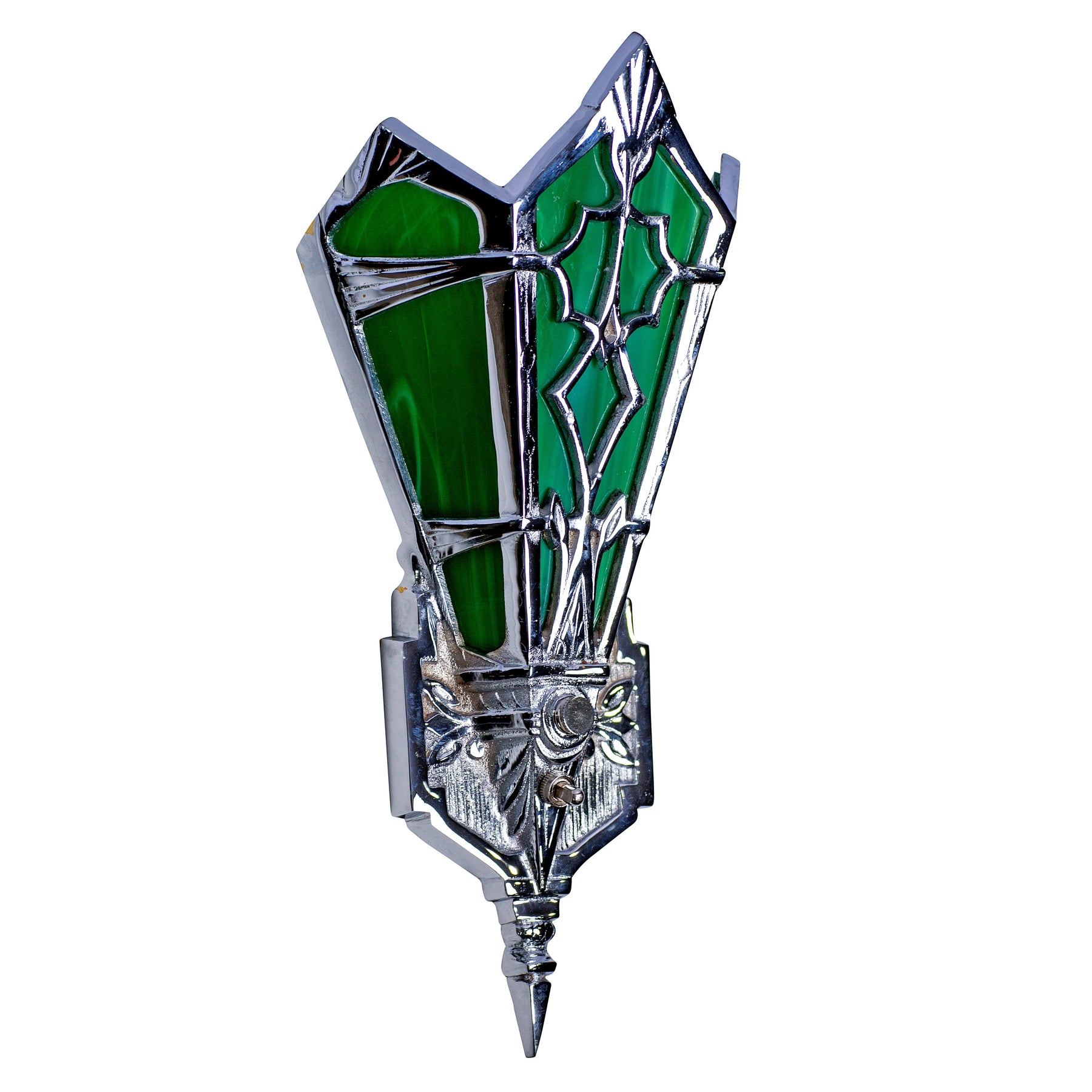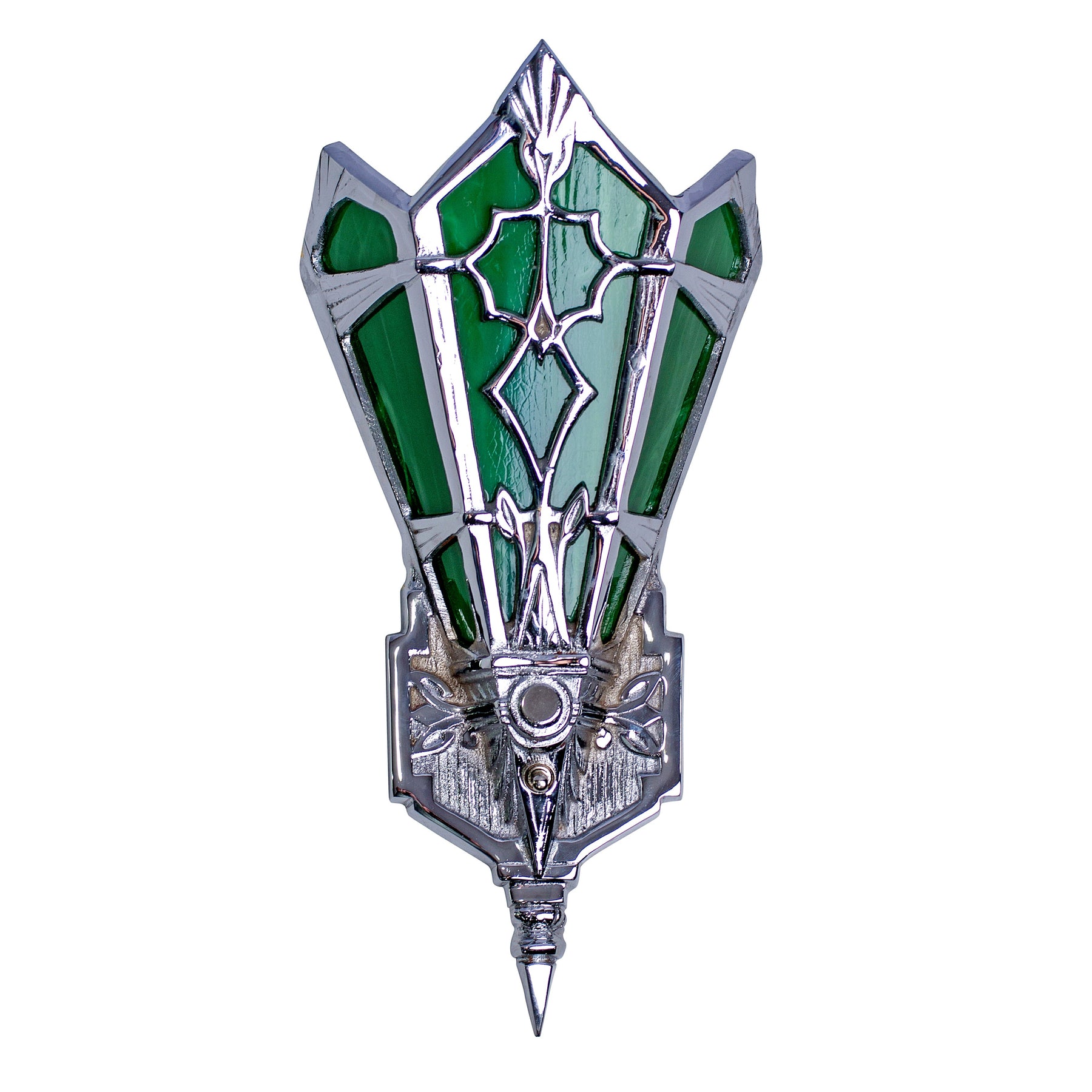 • This is an Art Deco Wall Sconce with deco green stained glass. Each sconce measures 14 inch tall by 6 1/2 inch at it's widest point. Each of our sconces project 3 1/2 inch from the wall. Every sconce can fit a single low heat emitting candelabra light bulb and this fixture comes complete with the mounting hardware. We recommend low heat emitting bulbs.