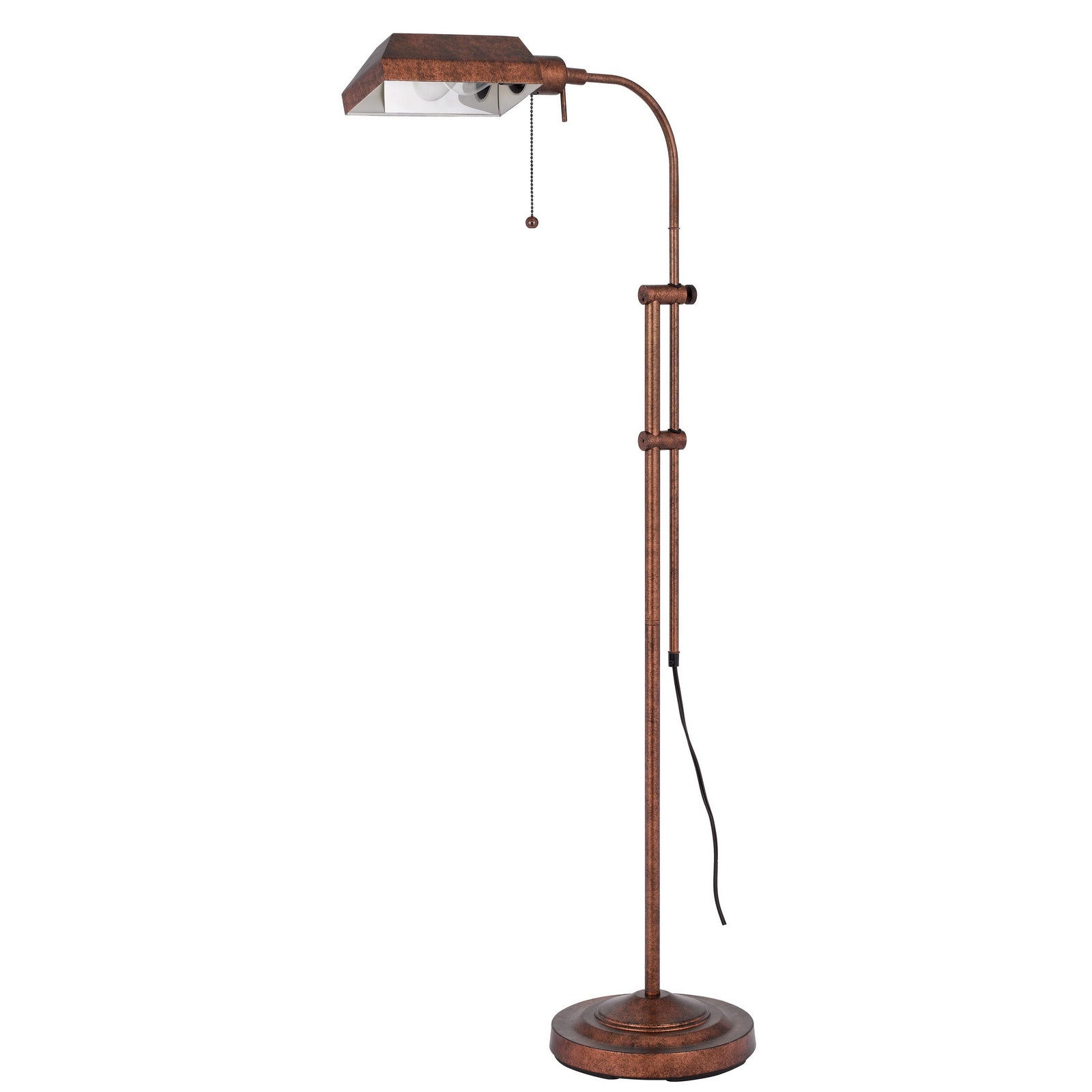 The BO-117FL-RU 100W Pharmacy Floor Lamp is a perfect blend of durability and functionality, featuring a robust metal construction that ensures longevity. This lamp offers adjustable height settings, ranging from a minimum of 42 inches to a maximum of 57.5 inches, making it versatile for various spaces. The hood dimensions are 8 inches long, 3.75 inches wide, and 2.75 inches high, while the head can rotate 90 degrees in both directions for directed lighting. It operates with a convenient pull chain mechanism and is finished in a stylish rust color. Assembly is required, and it comes with a one-year warranty, ensuring reliability and satisfaction.