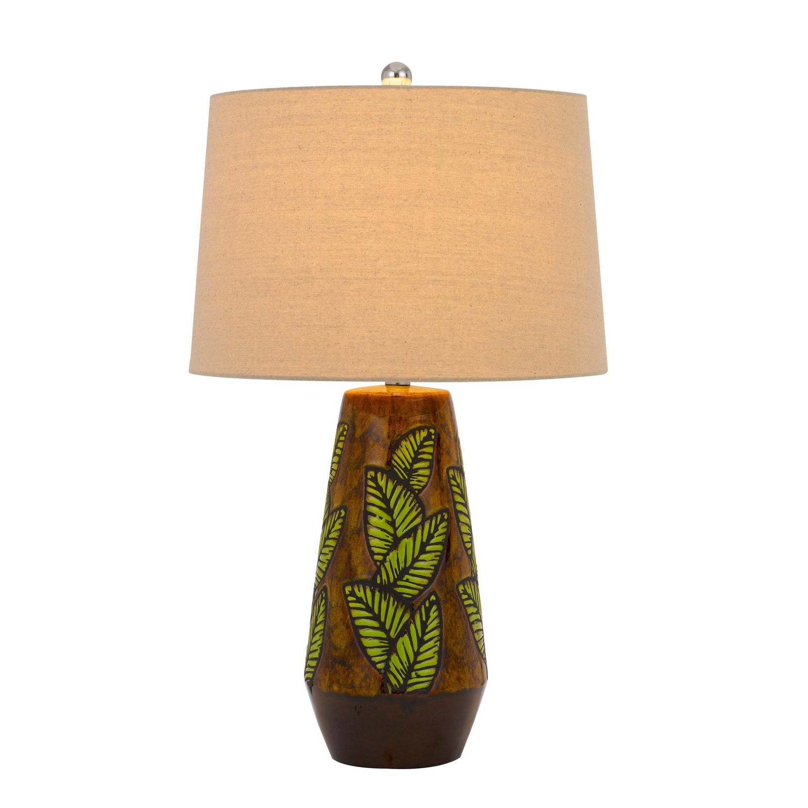 The BO-2973TB 150W 3-way Hanson ceramic table lamp adds a tropical vibe to your space with its elegant brown ceramic leaf print design. Constructed with durable materials, this lamp features a weighted base for better balance and a hardback fabric taper drum shade that enhances its aesthetic. The lamp requires one E26 bulb (not included) with a maximum wattage of 150W and requires minor assembly. With a package dimension of 18.00\