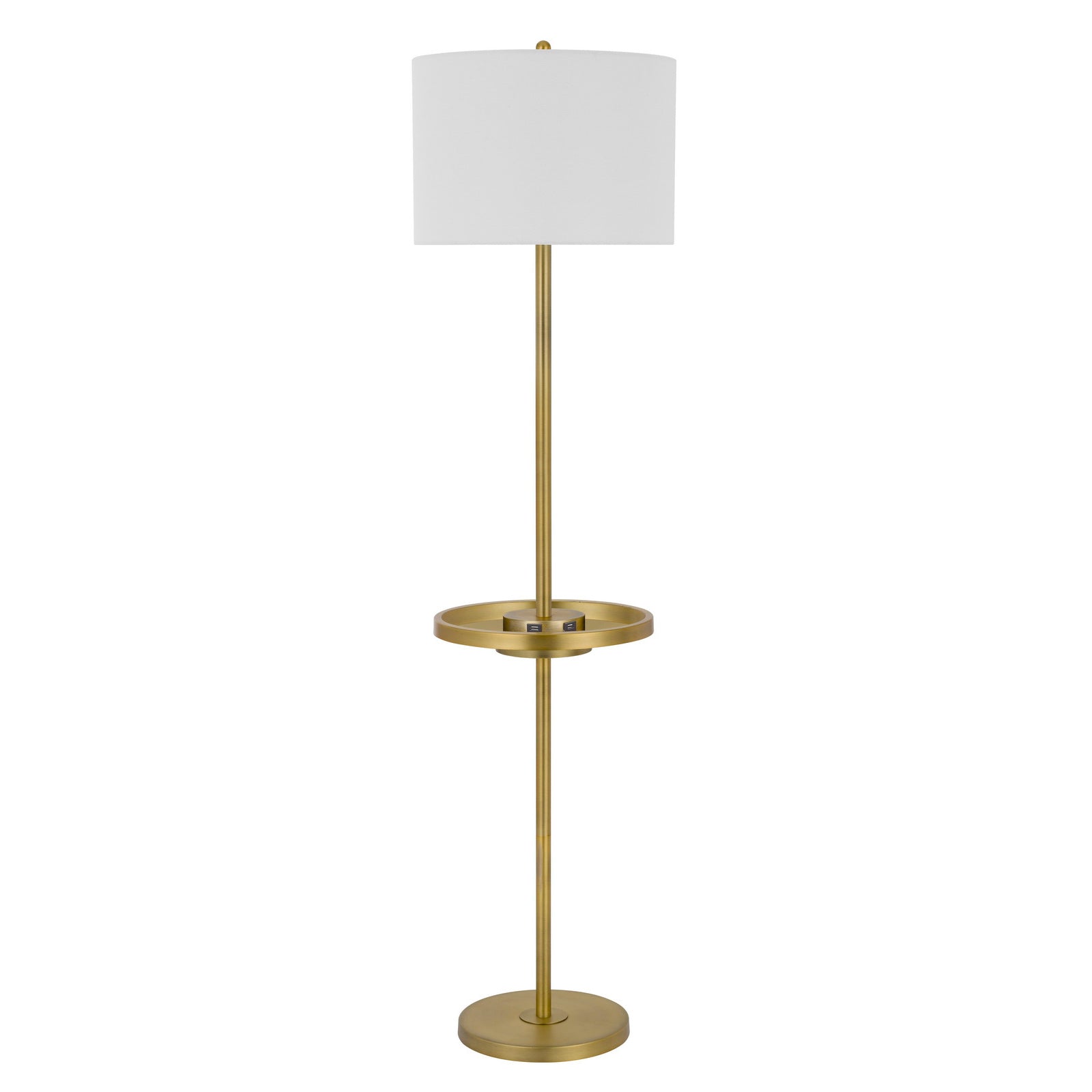Introducing the Crofton Floor Lamp (Product No. BO-2983FL-AB), a stylish and functional lighting solution for your home. This 150W 3-way lamp features a modern antique brass finish and is equipped with a centered metal tray table, measuring 13 3/4 inches in diameter and 1 inch in height, offering convenience for your essentials. Additionally, it comes with two USB charging ports for easy access to power. Constructed from durable metal, this lamp stands on a heavy-duty base providing excellent stability. The elegant off-white hardback fabric drum shade diffuses light beautifully, making it perfect for enhancing your seating area or entertainment room. With minor assembly required, this lamp is ready to brighten your space in no time.