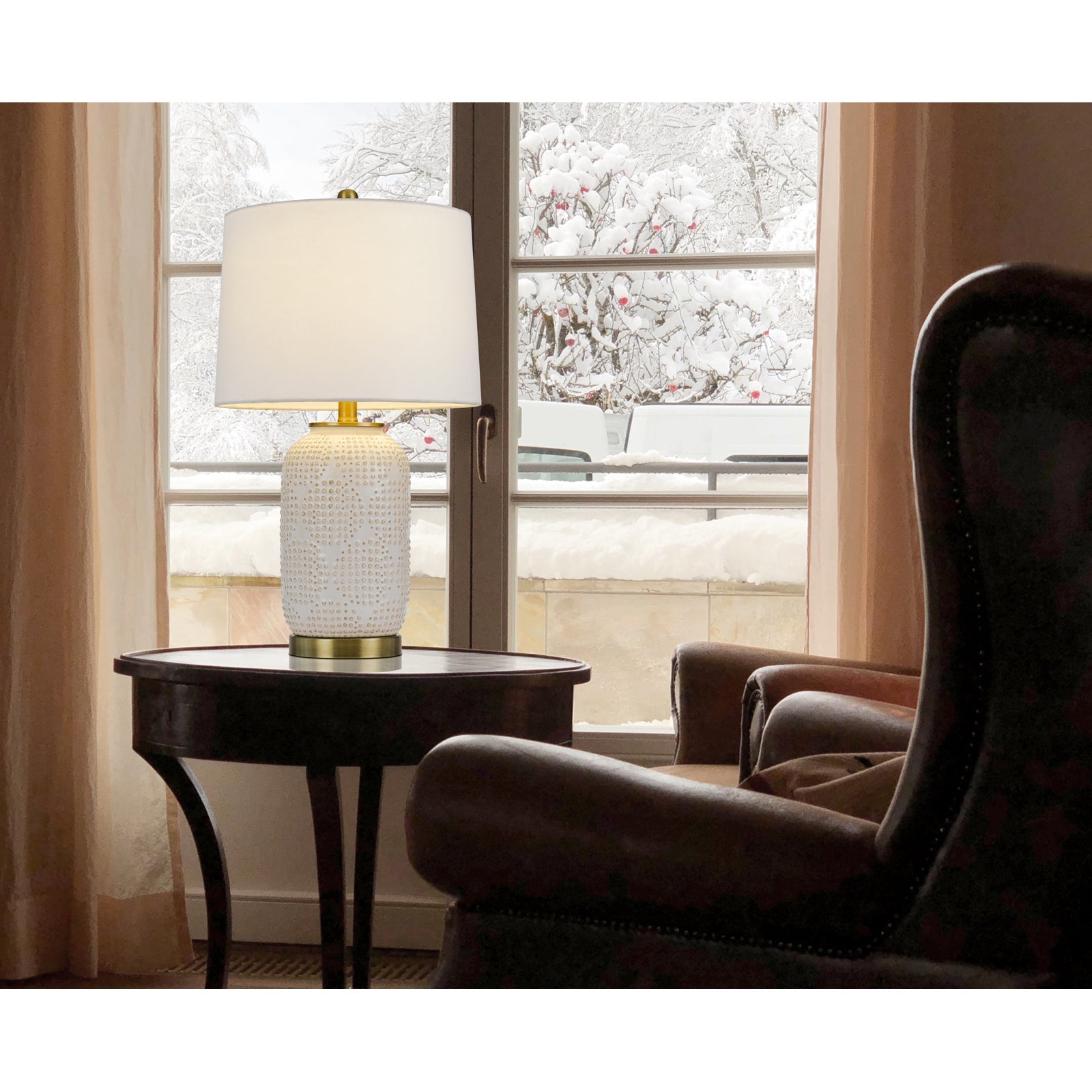 The BO-3022TB 150W 3-way Sedalia ceramic table lamp is a stunning addition to any home decor. Featuring a beautiful pearl white ceramic body with a dot design and a hardback fabric shade, this lamp adds a touch of elegance to your living space. Its unique mason jar design, coupled with an ivory finish, complements a variety of interior styles. The lamp is supported by a sturdy metal base and includes a matching finial. Designed for convenience, it accommodates one E26 bulb and offers a 3-way switch for adjustable lighting. Measuring 14.50 inches in length, 15.50 inches in width, and 18.50 inches in height, this lamp is both functional and stylish, making it a perfect choice for any room.