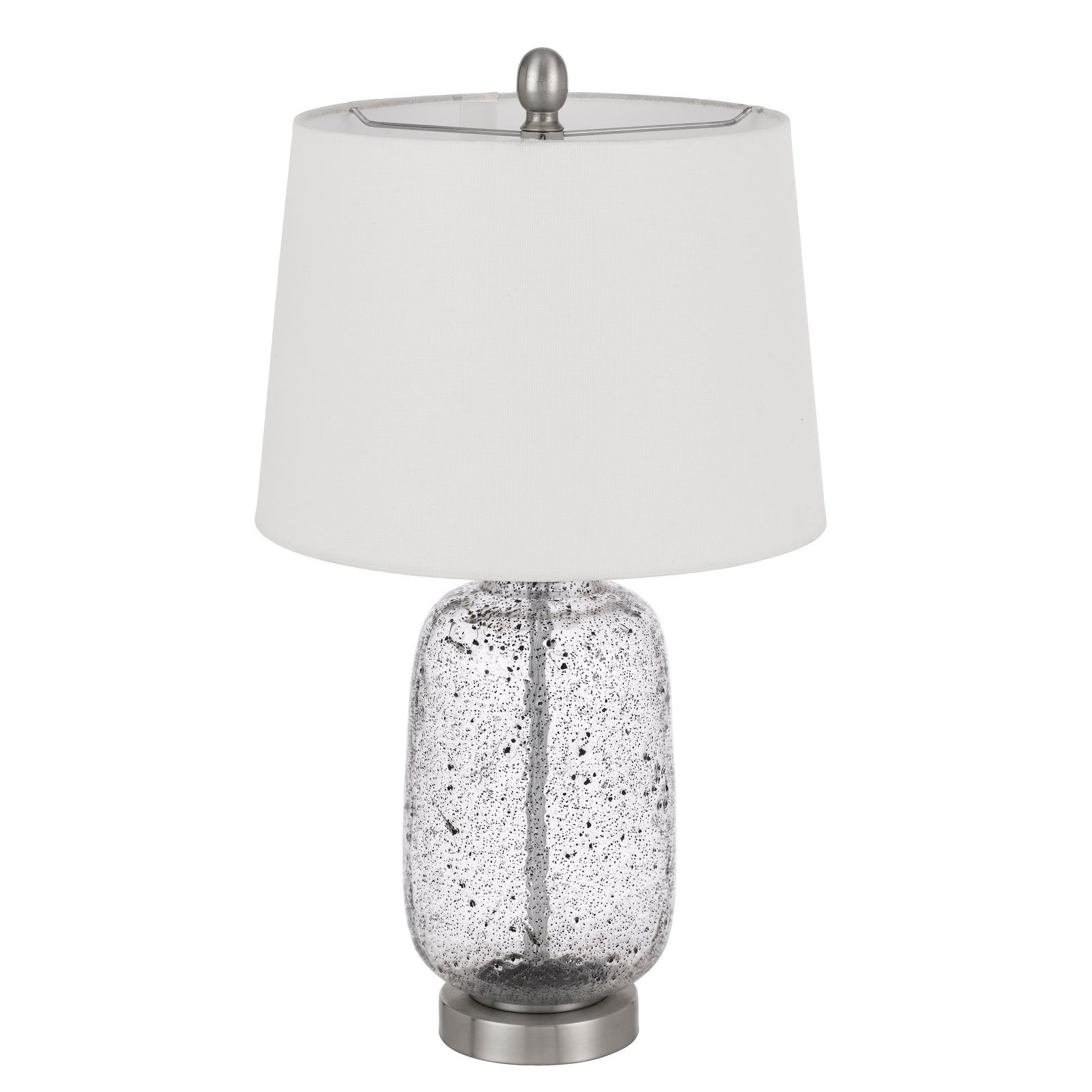 The Solaro Distressed Glass Table Lamp, Product No. BO-3037TB, features a stunning modern design with clean lines that effortlessly complements contemporary interiors. It boasts a durable glass construction with a stylish bubble glass finish, and includes a hardback linen shade for a warm and inviting glow. The lamp operates with a convenient 100 Watt on/off switch and is designed with a weighted base for added stability. Measuring 14.00 inches in length, 15.50 inches in width, and 15.00 inches in height, it ships in one carton and requires minor assembly. Cal lighting provides a one-year warranty, ensuring that this fixture is free from defects in material and workmanship.
