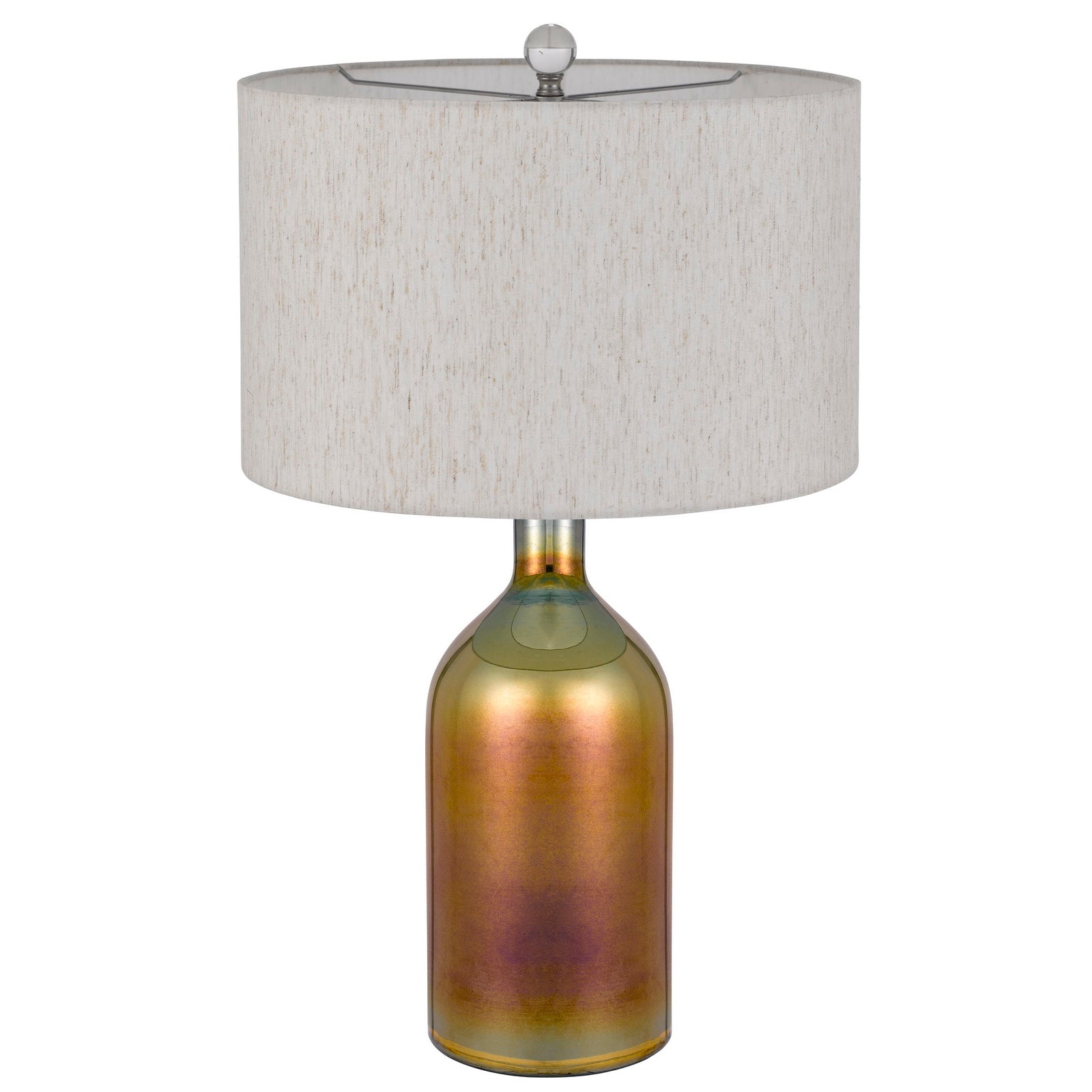 The Inzago Glass Table Lamp, Product No. BO-3039TB, combines casual elegance with functionality. Featuring a durable glass construction and an iridescent finish, this lamp is designed to enhance any room's aesthetic. It includes a hardback linen shade and operates with a 150W three-way switch for adjustable lighting. With a classic jar-style silhouette, it measures 17.00 inches in length, 17.00 inches in width, and 18.50 inches in height, making it a perfect fit for various settings. The lamp's E26 bulb base and minor assembly requirement ensure ease of use. This product ships in one carton and comes with a one-year warranty against defects in material and workmanship.