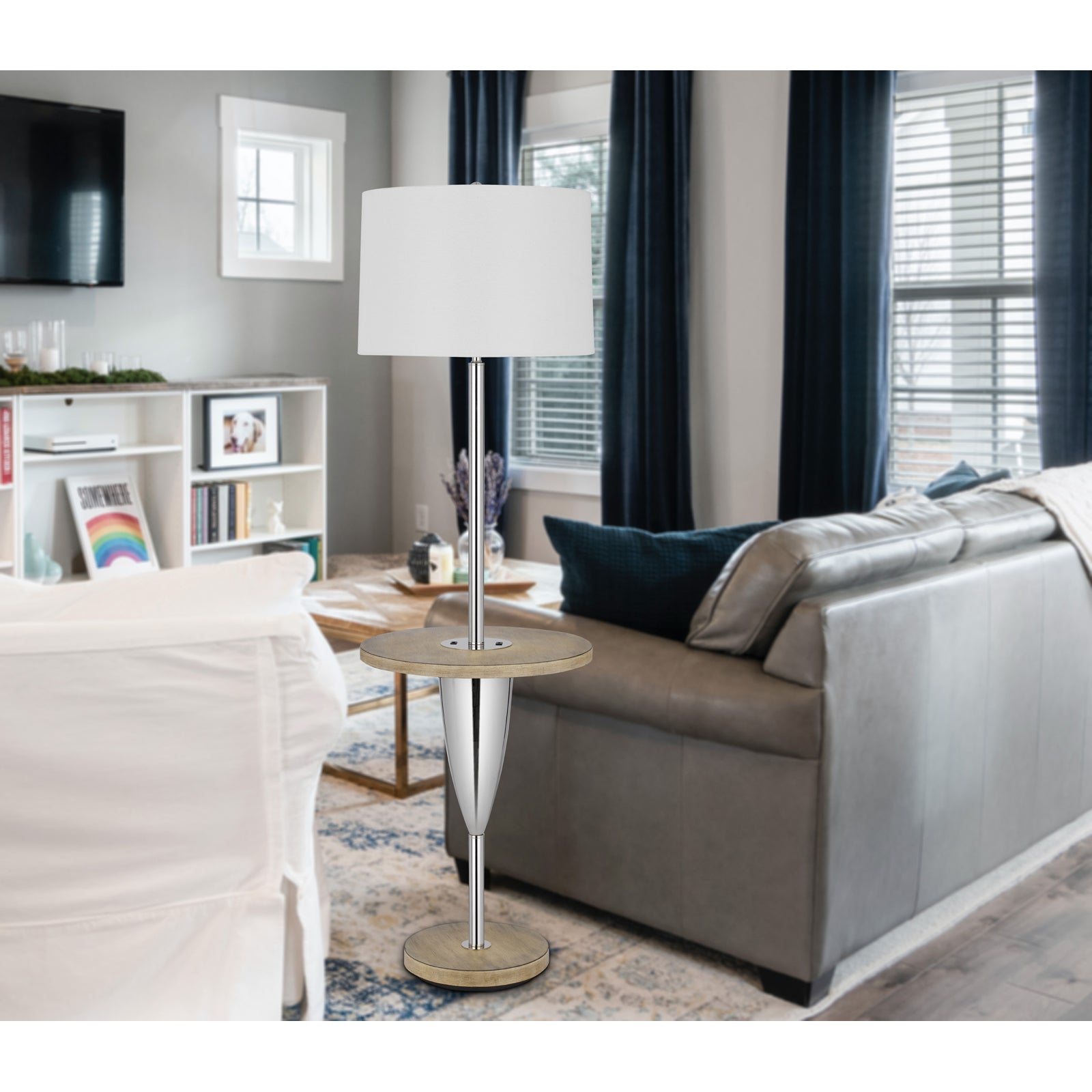 The BO-3054TFL 150W 3-Way Lockport Metal Floor Lamp is a perfect blend of style and functionality for any room. Featuring a durable metal construction with a high gloss chrome finish and elegant wooden accents, this lamp is designed to enhance your space. It comes equipped with a circular wooden tray table at the center, offering convenience alongside a functional USB port and a Type C USB charging port for your devices. With its weighted base for stability and a chic hardback fabric shade included, this lamp not only illuminates but also beautifies your area. It requires one E26 bulb (not included) and measures 20.30 inches in length, 20.30 inches in width, and 18.00 inches in height, ensuring it fits seamlessly into your decor.