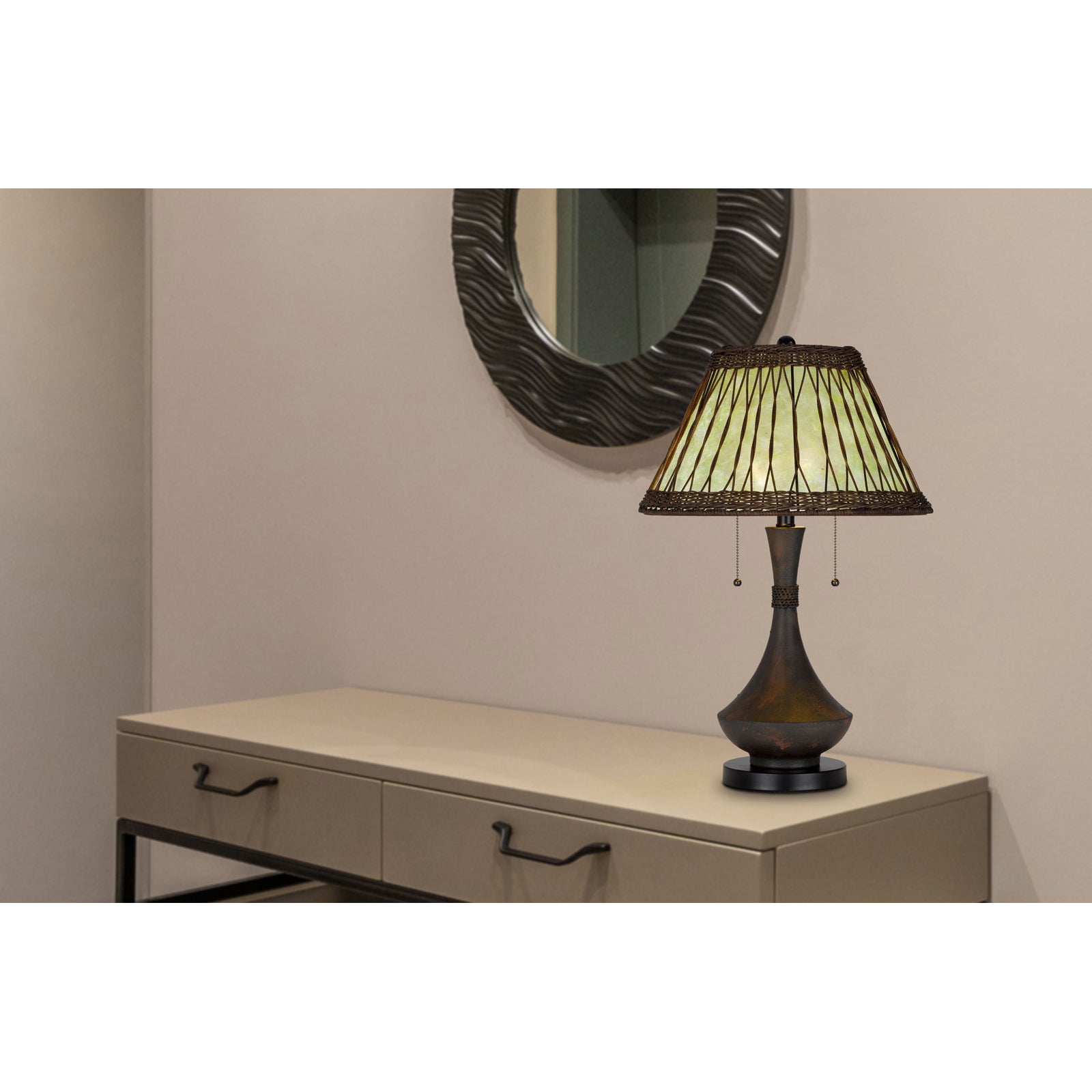 The Mateo Table Lamp (Product No. BO-3103TB) combines durability and style with its robust metal and resin construction. It features two pull chain switches for convenient on/off control and comes with a beautiful rattan shade that adds a tropical flair to any room. The painted green shade enhances its aesthetic, while the wicker decorative trim adds a touch of charm. This lamp requires two E26 base bulbs, each with a wattage of 60W, and ships conveniently in one carton. Ideal for everyday use, it requires assembly and comes with a one-year warranty, ensuring quality craftsmanship and material.
