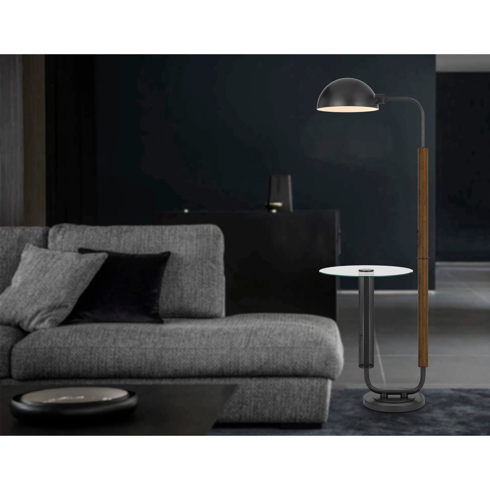 100W KEYSER METAL FLOOR LAMP WITH FAUX WOOD POLE AND GLASS TRAY TABLE AND METAL SHADE. EQUIPPED WITH 1 USB AND 1 USB-C CHARGING PORTS