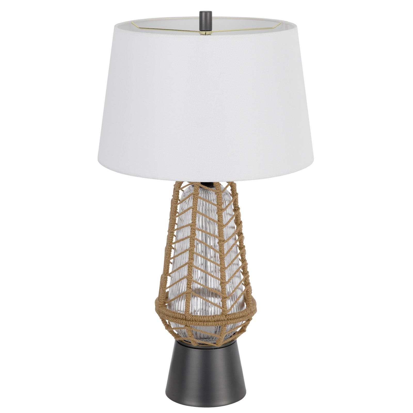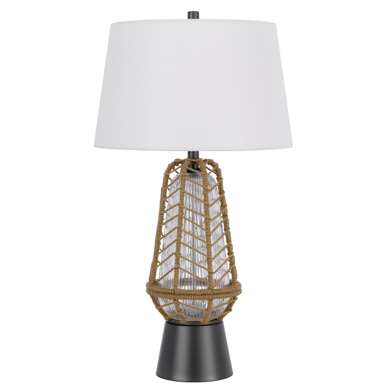 The Hanko 100W 3-Way Table Lamp with a 2W LED night light offers a contemporary twist on classic lantern style. It features a durable glass and metal construction with a stylish burlap-wrapped base and braided burlap decorative accents. The lamp has a 3-way rotary switch on the socket, allowing for versatile lighting options. With a weighted base for added stability, it's perfect for any room. The hardback fabric shade provides an uplight direction, enhancing your home atmosphere. This lamp is designed for easy minor assembly and comes with a one-year warranty against defects.