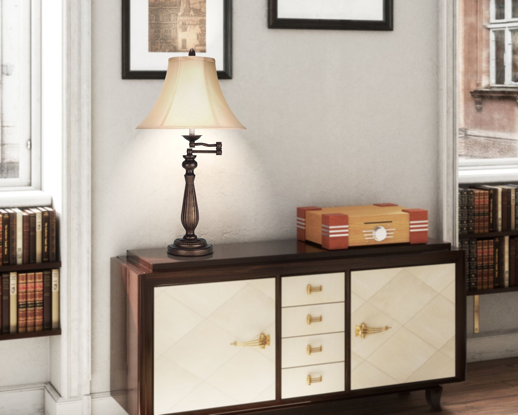 The BO-581TB 150W 3 Way Swing Arm Table Lamp combines style and functionality with its durable metal construction and attractive antique rust finish. Standing at 30 inches high, this lamp features a fully functional swing arm, allowing you to adjust the light direction to suit your needs. It comes with a 6-foot power cord for easy placement, and it requires minimal assembly. The lamp uses one E26 base bulb and offers a 3-way switch for versatile lighting options. Perfect for any setting, it also includes a one-year warranty against defects.