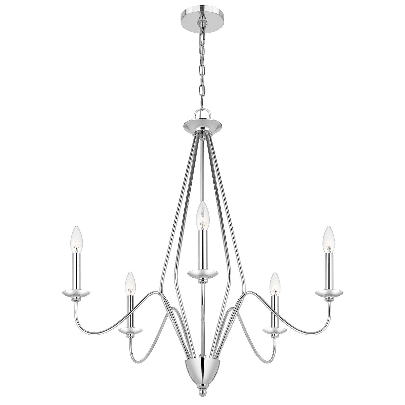 The Norwich Metal Chandelier, Product No. FX-3774-5, is a striking addition to any contemporary space, featuring a durable metal construction with a sleek chrome finish. This chandelier includes a canopy and comes with six feet of chain for adjustable hanging. It accommodates five E12 candelabra base bulbs with a maximum wattage of 60W each, ensuring ample illumination. With minor assembly required, this stylish fixture ships in one carton and is hardwired for safety. Backed by a one-year warranty, it is a perfect blend of functionality and modern elegance.