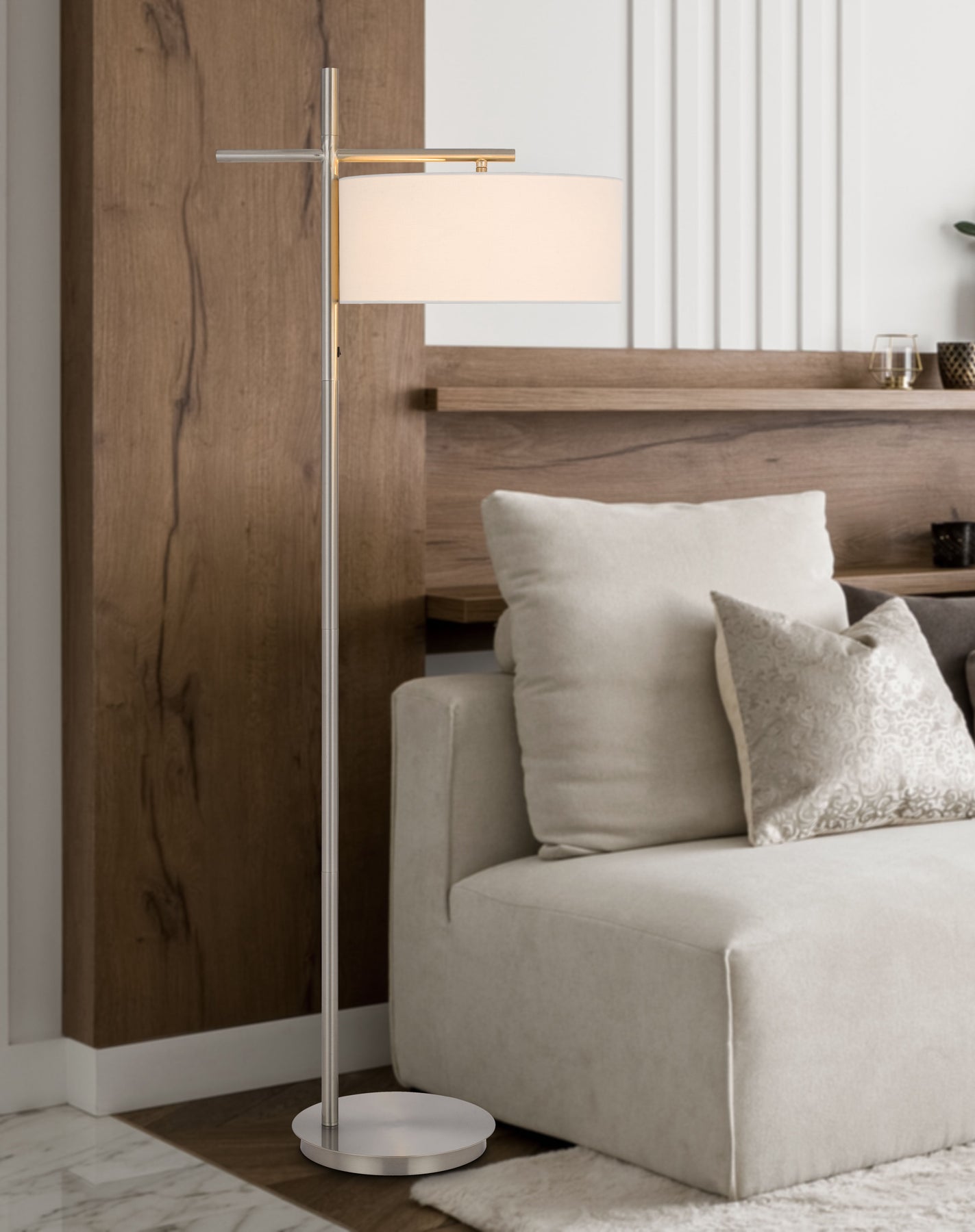 The Laval Metal Floor Lamp (Product No. LA-8039FL) is designed to elevate your space with its elegant simplicity. Made from durable metal construction, this lamp features a slim pole style frame and a weighted base for added stability. It includes a convenient rocker switch on the pole for easy operation, and a stylish downbridge design that accommodates a hardback fabric shade. This lamp uses one E26 bulb with a maximum wattage of 100W and requires minor assembly. With its brushed steel base color, it seamlessly complements various decor styles, making it a versatile addition to any room.