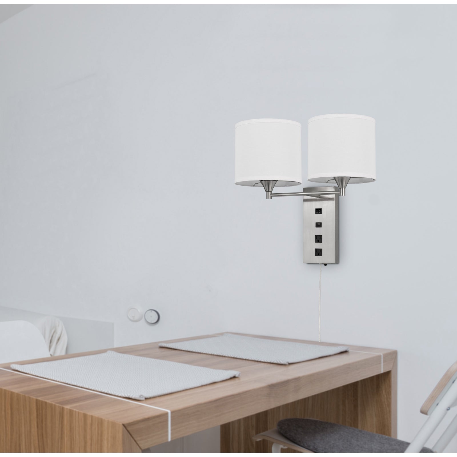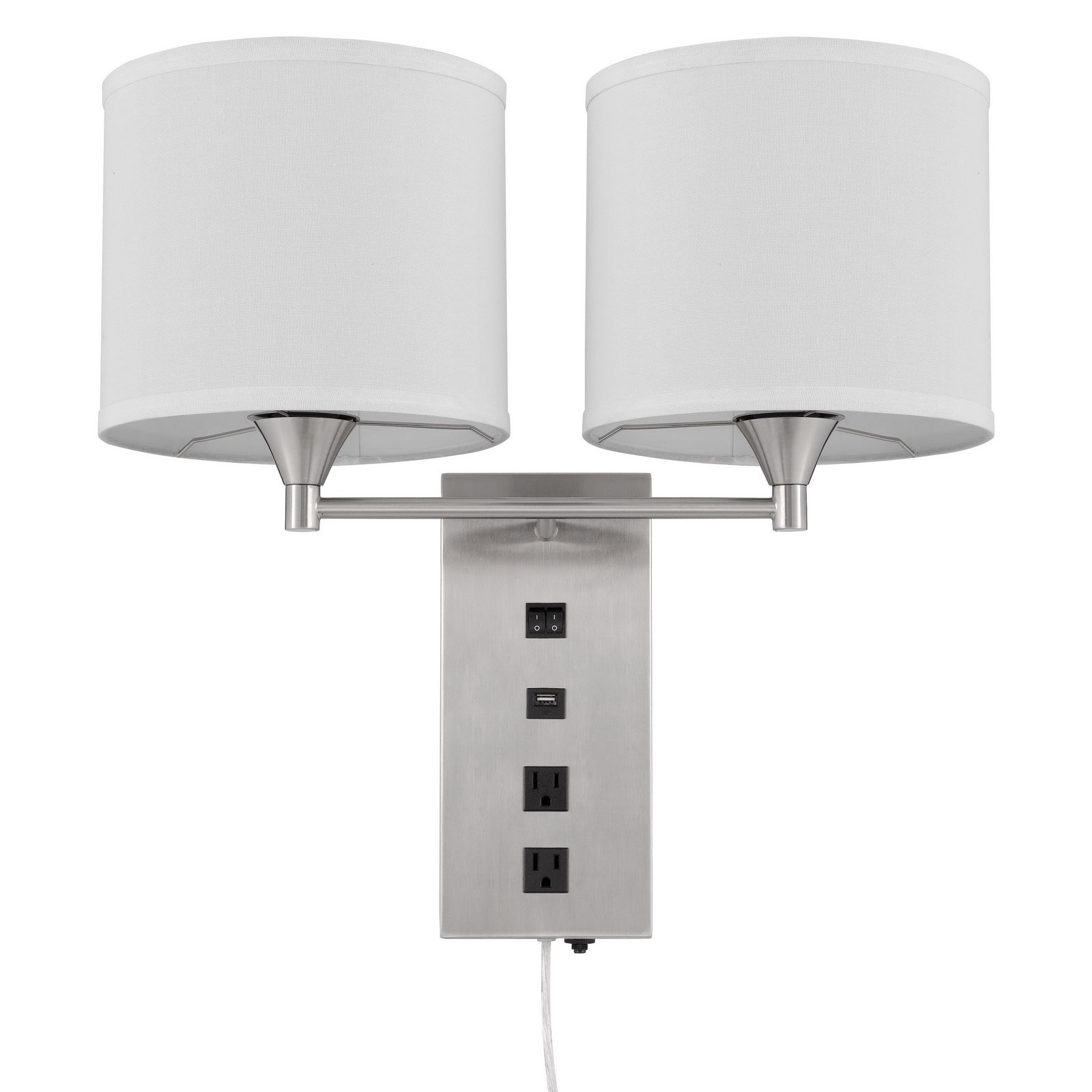 The Reedsport Wall Lamp (Product No. LA-8049W2L-1) is a modern and functional lighting solution that enhances any room's decor. This lamp features a durable metal construction and includes two 60W light fixtures, ensuring ample brightness. It is equipped with two power outlets and one USB charging port on the base for added convenience. The rocker switch allows for easy operation, while the round hardback fabric shade softens the light for a cozy ambiance. With a package dimension of 5.90 L x 22.00 W x 16.00 H, this stylish lamp is perfect for various settings and is both practical and elegant.