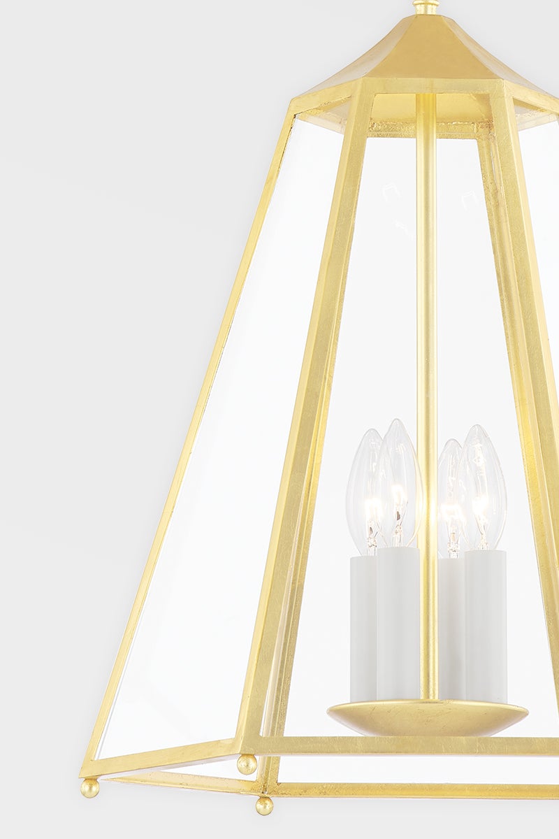 The Nottingham Pendant by Hudson Valley Lighting combines elegance with functionality. This stunning fixture features a clear glass shade and showcases four bulbs with a maximum wattage of 60W, requiring E12 candelabra base sockets (not included). With a width/diameter of 16.00 inches and a height of 21.50 inches, it fits perfectly in various spaces. The pendant is available in a luxurious Gold Leaf finish and is UL Damp rated, making it suitable for use in high-humidity areas.