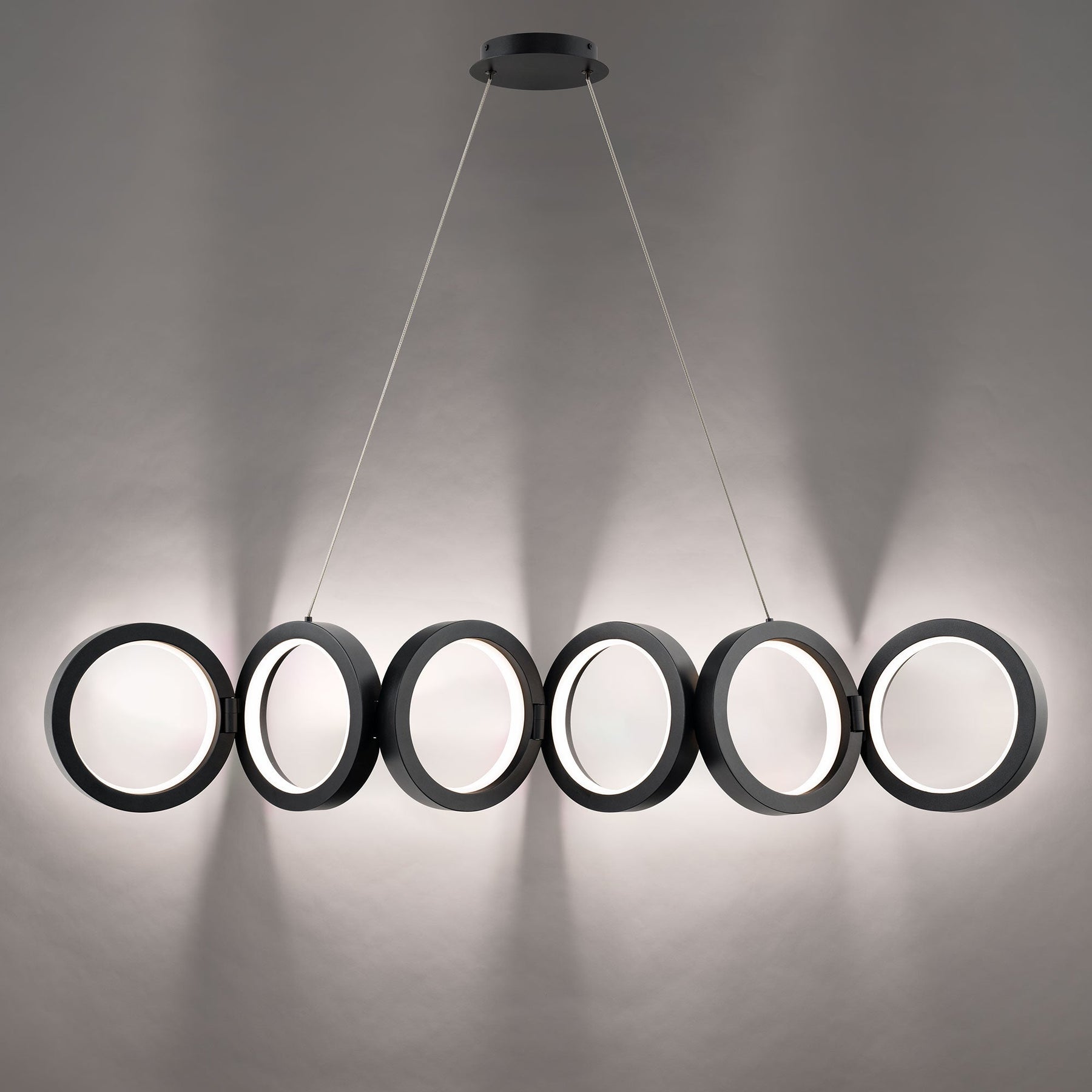 Cabot 48in LED Linear Pendant 4000K in Black. In the round. Rings of light glow softly through flush opal diffusers. Perfectly tethered to each other, this foldable design can be adjusted as desired along its linear length. Featuring an extruded aluminum body, with acrylic diffusers and adjustable rings Ultra-sleek electrified cable eliminates the need for clunky power wires. Height is simple to adjust through push pin connectors on the canopy. Sloped ceiling compatible. Driver is located in the canopy and installs within a junction box. Smooth and continuous dimming with an electronic low voltage (ELV) or TRIAC dimmer. High Powered Replaceable LED Module CRI: 90, Rated Hours: 50,000, Selectable Color Temp: 2700K-3000K-3500K-4000K Standards: ETL & cETL UL 1598 listed for Damp Locations.