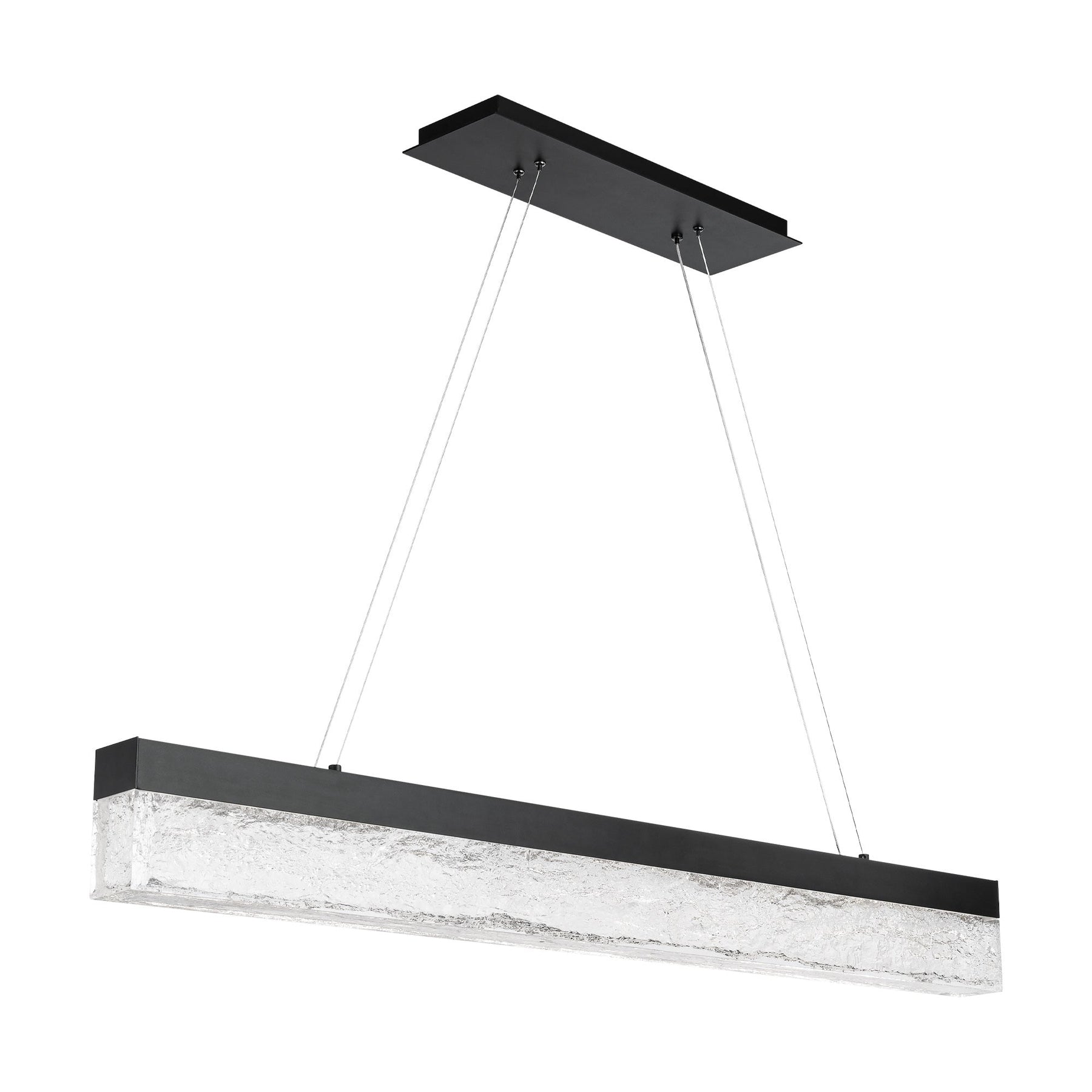 Effervescent 45in LED Linear Pendant 3000K in Black. A glamourous facade of illumination, rooted in a minimal elegant aesthetic that is substantial enough to be an iconic piece of architectural lighting with style and proportion. Simply a glittering, breathtaking presentation of light. Effervescent is a 45-inch linear pendant featuring a cutting edge translucent acrylic shade with bark-textured interior patterns that create an impressive reflective quality. Carefully suspended by four electrified aircraft cables, Effervescent eliminates the need for dangling power cords found in traditional LED pendants. The arrangement of energy efficient integrated LED's in its frame passes light through the patterns of the acrylic for an effective downlight and ambient light delivery. Available in black or brushed aluminum finishes. The Effervescent linear pendant is a glittering, breathtaking presentation of light. Energy efficient integrated LED's are concealed behind a substantial acrylic diffuser with tree-bark texture creating a bright and even illumination. Ultra-sleek electrified cable eliminates the need for clunky power wires. Height is simple to adjust through push pin connectors on the canopy. Universal Input Voltage Driver (120V-240V-277V). Custom CCT options available by special order. Smooth and continuous dimming with an electronic low voltage (ELV) dimmer. High Powered Replaceable LED Module CRI: 90, Rated Hours: 50,000, Color Temp: 3000K Standards: ETL & cETL UL 1598 listed for Damp Locations. CEC Title 24 Compliant.