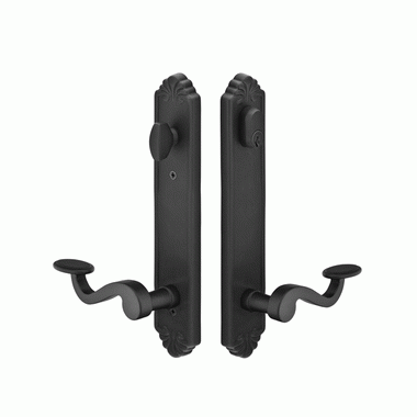 Solid Brass Tuscany Keyed Style Multi Point Lock Trim (Flat Black Finish) - This attractive lock trim from Emtek features a medium bronze finish. Measures 2 inches wide by 10 inches tall. Also includes a 6 inch center to center hole spacing. Sold as a complete set, which includes plates, handles and cylinder. Multi point mortise lock box is not included. Trims only.[/description]