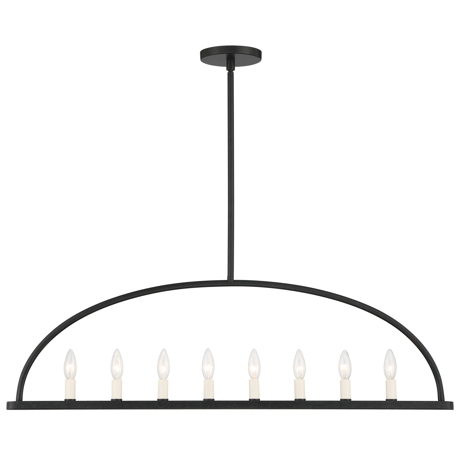 The Abbott linear chandelier presents a simple, streamlined shape and clean lines. The open-concept frame features a metal arch and a sleek, narrow rod with a series of thin bulbs. Mounted above an island or over a dining room table, this fixture appeals to a minimalist sense of style and comes with both white and gold candle sleeves. The Abbott comes in vibrant gold and black finish.