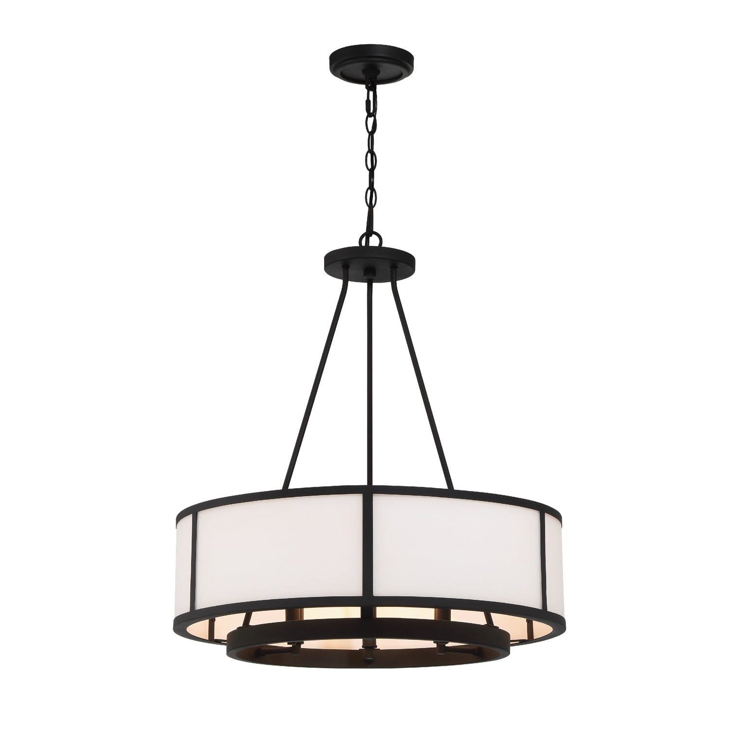Showcasing a classic drum pendant, the Bryant is crafted with a white glass shade and black steel frame. The outer drum surrounds an inner suspension of candelabra sockets. The contrasting materials and bold graphic lines provide a design-driven style and a striking visual accent to many interior settings.