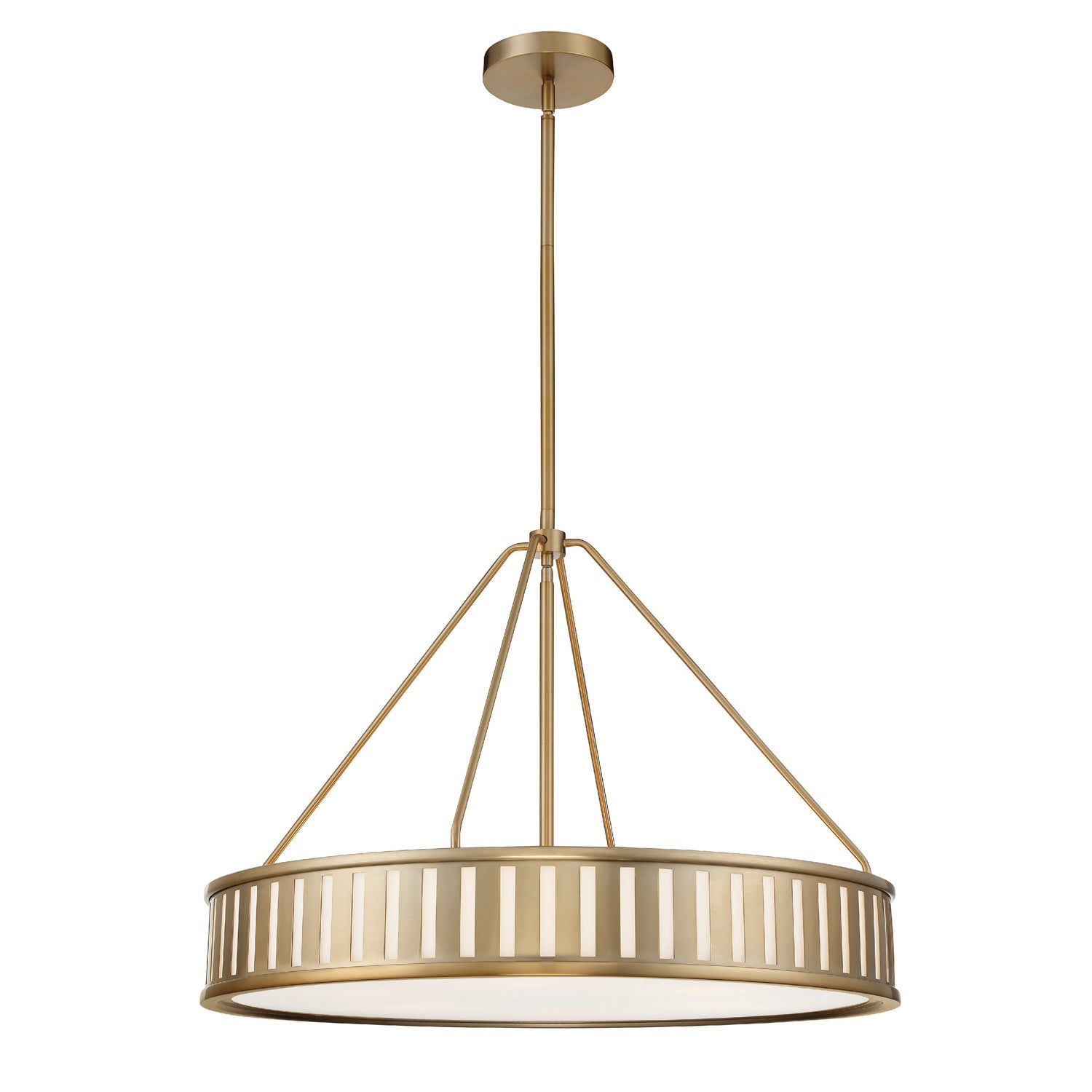 The contemporary Kendal collection makes a statement with its graphic uniform pattern. Its metal frame surrounds white glass in this elegant drum-shaped pendant. The high contrast of Vibrant Gold, Black Forged, or Polished Nickel against white glass is a great way to add a touch of drama to a room.