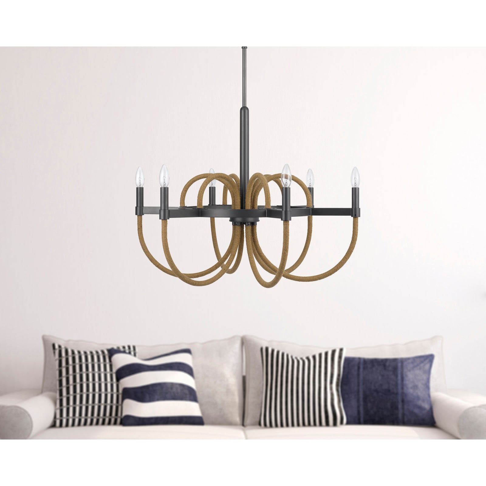 The Rowland 60W x 6 Metal/Burlap Roped Chandelier combines contemporary design with classic candelabra style, making it an ideal centerpiece for any room. This hardwired fixture includes six lights with E12 bulb bases, supporting a maximum wattage of 60W per bulb. Crafted from durable metal with braided burlap accents, it is both chic and sturdy. The chandelier features a 72-inch dark bronze chain for hanging and ships in one carton, complete with a canopy. Minor assembly is required, and it comes with a one-year warranty, ensuring peace of mind for your lighting choice.