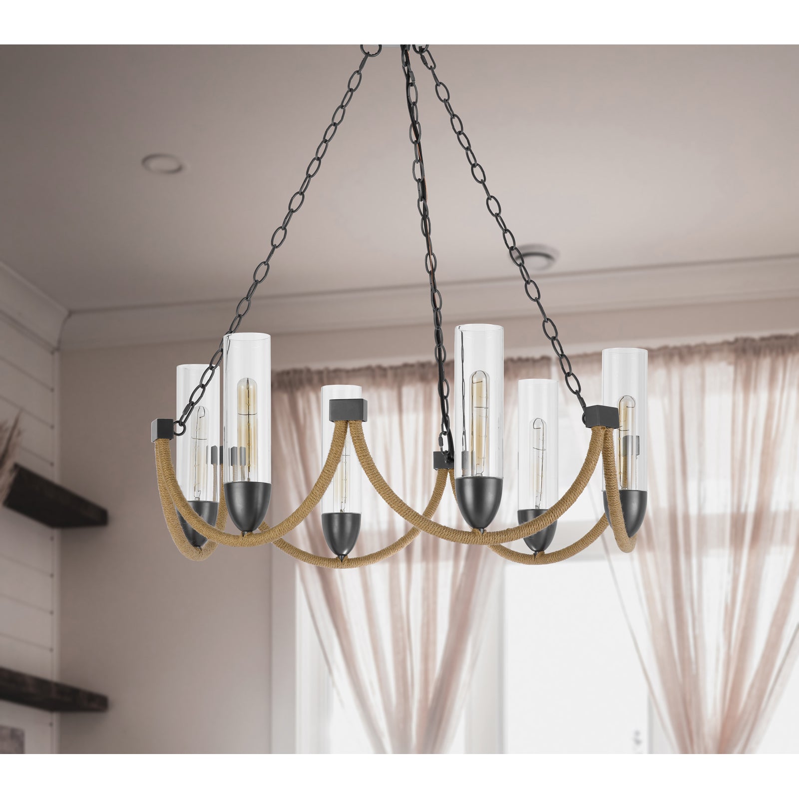 The FX-3815-6 Argyle Metal Chandelier is a stunning addition to any kitchen, living room, or dining room, combining contemporary design with functional lighting. This chandelier features a durable metal construction in a dark bronze finish, complemented by elegant cylinder glass shades and charming brown rope accents on the arms. Accommodating six E26 base bulbs with a total wattage of 360W, it provides ample illumination for your space. The fixture measures 34 inches in width and includes a matching dark bronze canopy along with a 72-inch chain for flexible height adjustment. Assembly is required, and it ships in one carton for convenience. Additionally, the product comes with a one-year warranty, ensuring peace of mind.