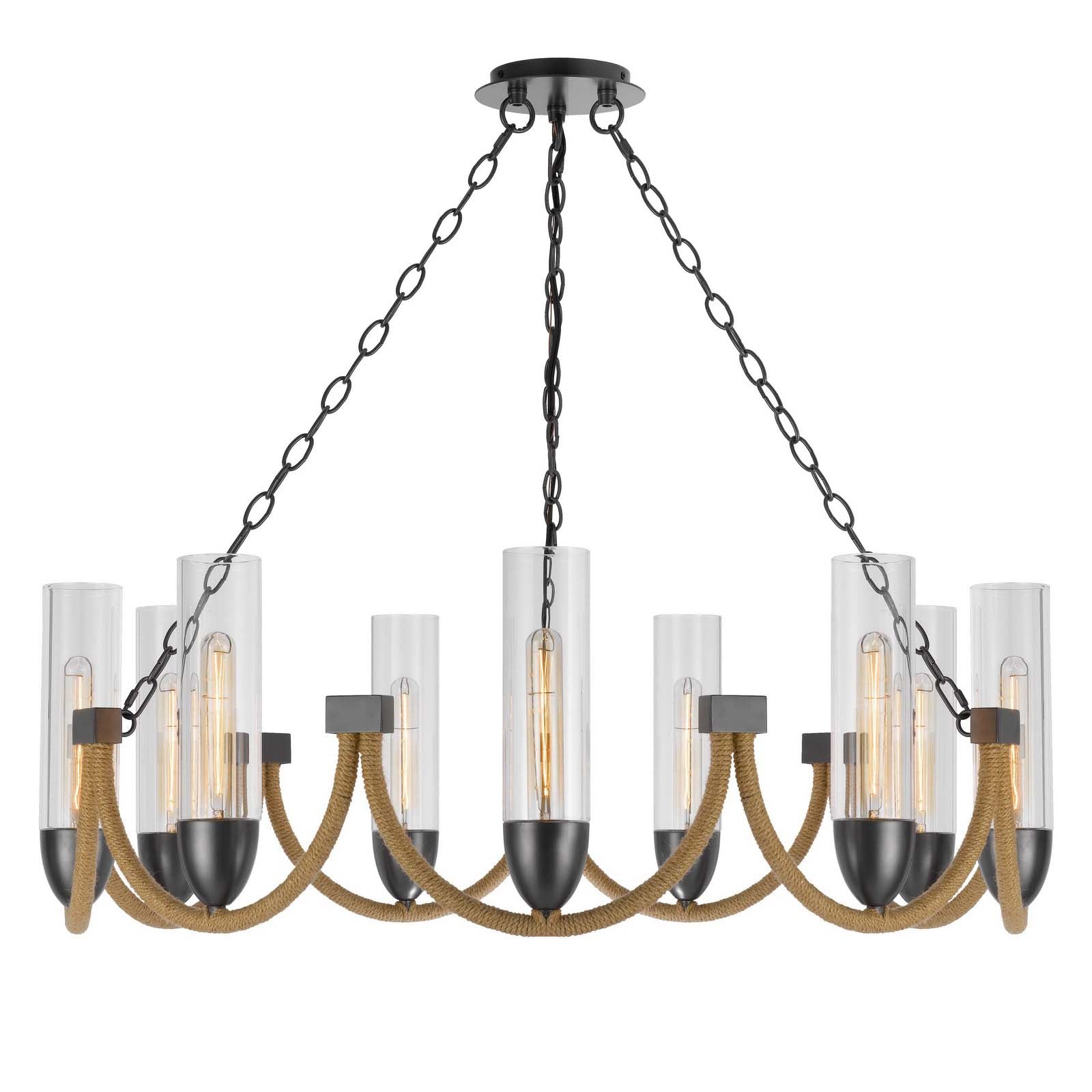 The FX-3815-9 Argyle Metal Chandelier is a stunning addition to any kitchen, living room, or dining room, offering a contemporary candelabra style. With a robust construction of durable metal and a captivating dark bronze finish complemented by brown rope accents, this chandelier features nine cylinder glass shades that require E26 base bulbs, each with a maximum wattage of 60W. Measuring 60W x 9, it includes a matching dark bronze canopy and ships with a 72-inch chain. Assembly is required, and it typically ships within three business days. Enjoy the peace of mind with a one-year warranty against defects in material and workmanship.