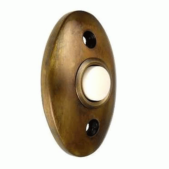 2 3/8 Inch Solid Brass Door Bell Button (Antique Brass Finish) - measures 2 3/8 inch tall and 1 5/8 inch wide. Comes complete with matching hardware screws. Works with two contact leads and standard doorbell circuits.