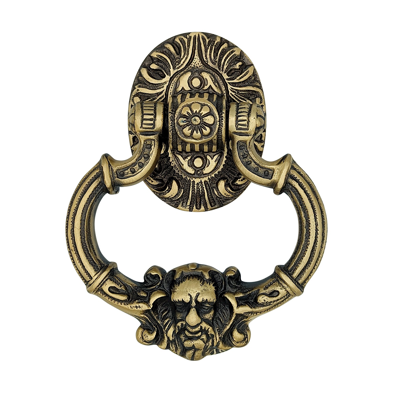 Neptune Door Knocker in Solid Brass (Antique Brass Finish): Measures 5 1/2 Inches wide and 7 inches tall. Solid Brass construction for decades of service - this item will patina nicely over time. Comes complete with mounting hardware.