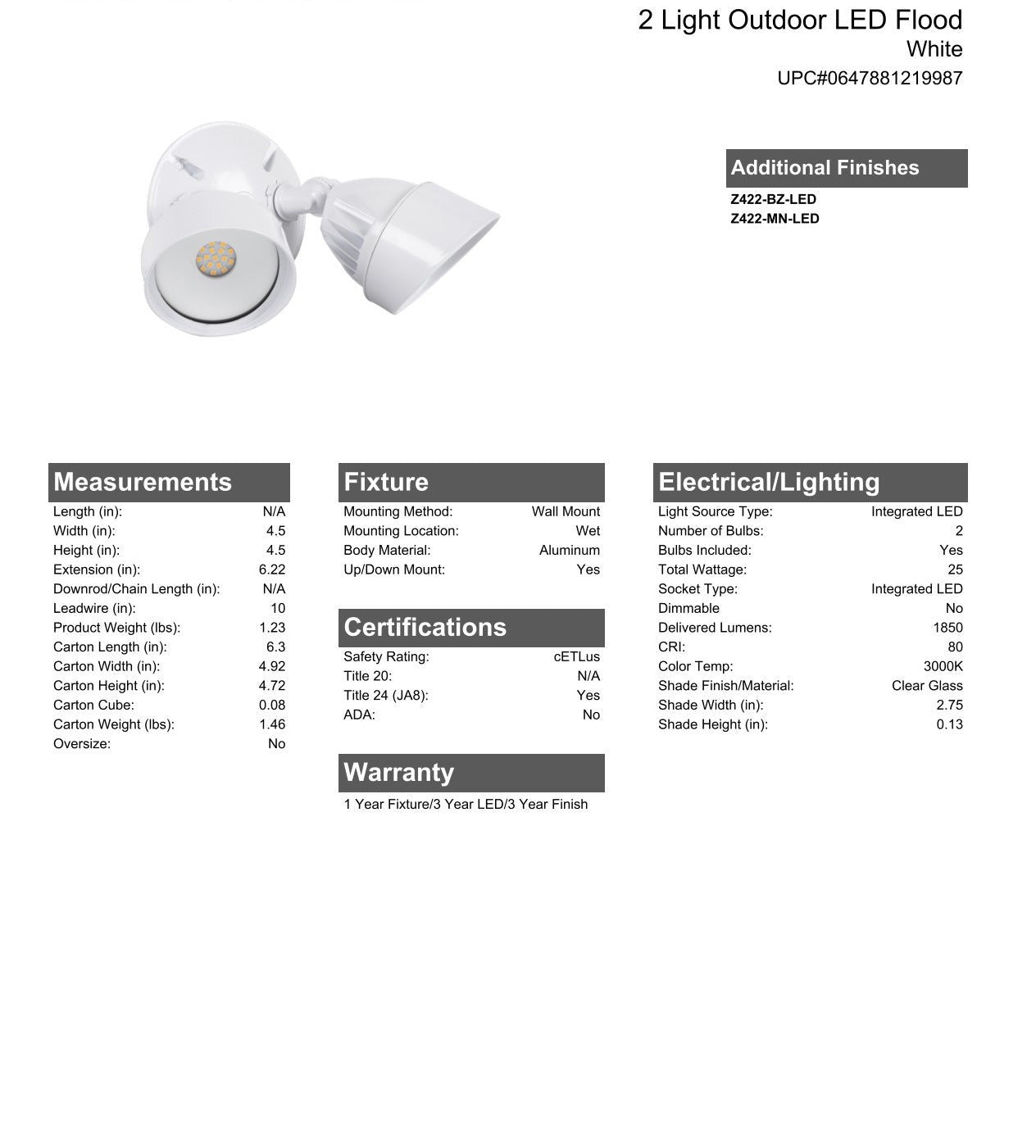 The Craftmade Double LED Flood Light provides brilliant illumination with energy saving technology. The 25 watt LED lamping provides 1850 lumens at 3000K. Optional 3" extension rod is available to order(part #RP-847-(finish)) if additional clearance is needed for better illumination. Available in Bronze, Midnight and White.