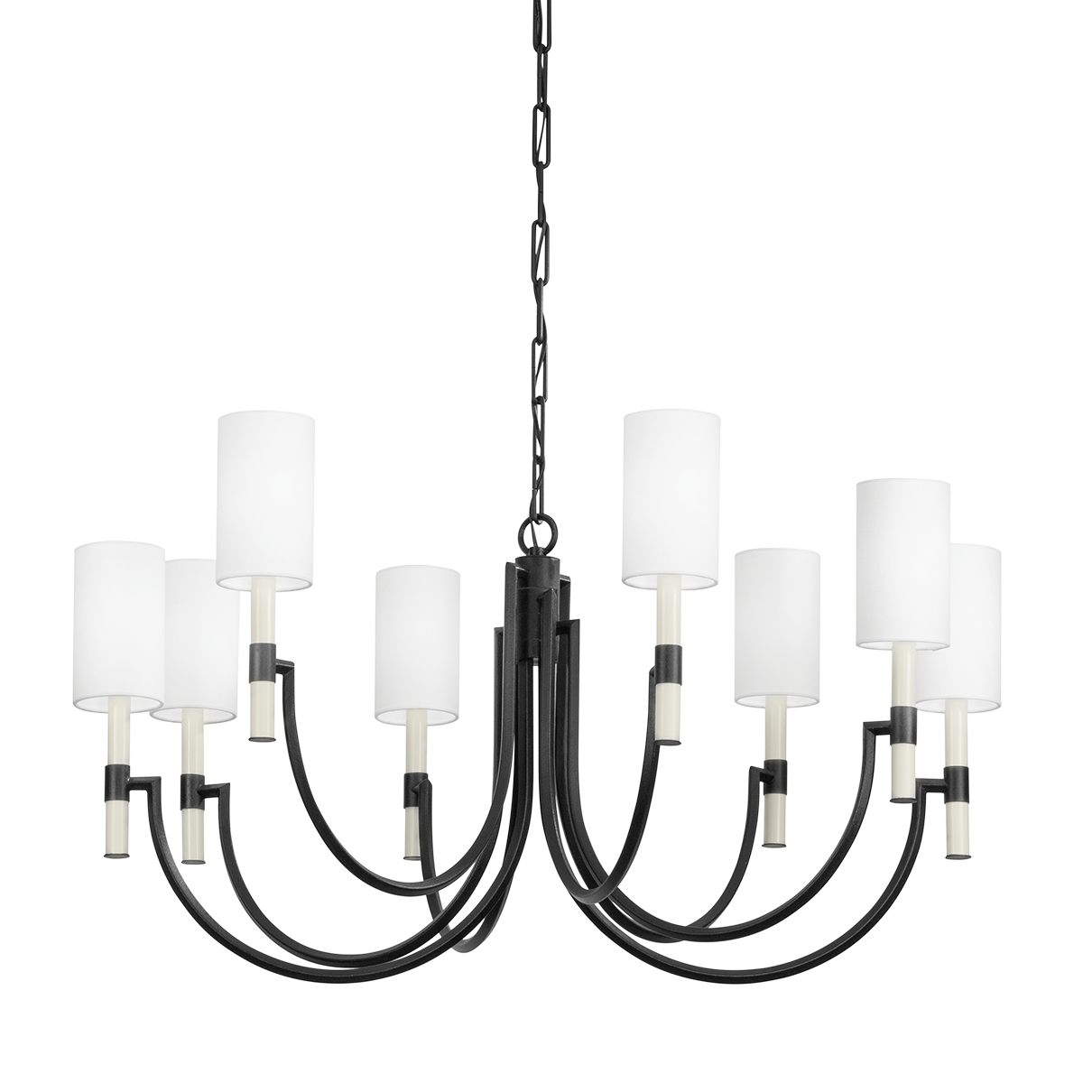The Gustine Chandelier by Troy Lighting is a stunning lighting fixture that will elevate any space with its elegant design. This chandelier features a generous width of 42.00 inches and a height of 19.50 inches, making it an ideal focal point for dining areas or living rooms. It boasts eight E12 candelabra base sockets that accommodate B11 bulbs (not included) with a wattage of 8.00 each. The shade is crafted from high-quality linen and comes in a refined finish of Vintage Gold Leaf, offering a touch of timeless sophistication. Designed for damp locations, it carries a UL Damp rating, ensuring its durability and suitability for various environments.