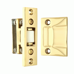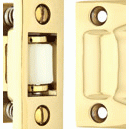 Roller Catch with Strike (Polished Brass Finish) - catch measures 1 inch by 3 3/8 inches and the strike measures 1 11/16 inches by 2 1/4 inches. Works with both left hand and right hand doors and this comes complete with the mounting hardware. Available in several finishes.