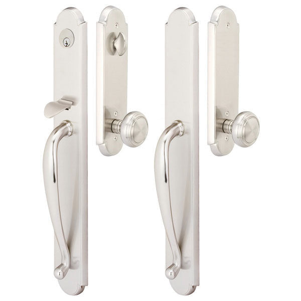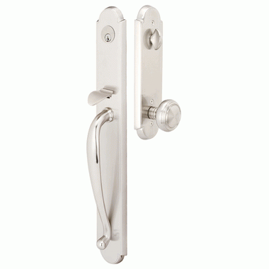 Solid Brass Albany Style Mortise Entryway Set (Brushed Nickel Finish) - this entryway set measures 2 7/8 inch wide by 19 3/8 inch tall. Various styles of knobs available at no additional charge. Entryway set deadbolt to knob center-to-center distance is 5 1/2 inches. Entryway mortise backset comes as 2 1/2 inch standard and a 2 3/4 inch backset is available if required. The overall grip thickness is 1 inch. The clearance between the door and grip is 1 7/16 inches. The plates have a thickness of 1/2 inch. This is a complete set and it comes with tubular latch mechanisms, strike plates, complete knob sets, internal mechanisms, deadbolts and all mounting hardware.[/description]
