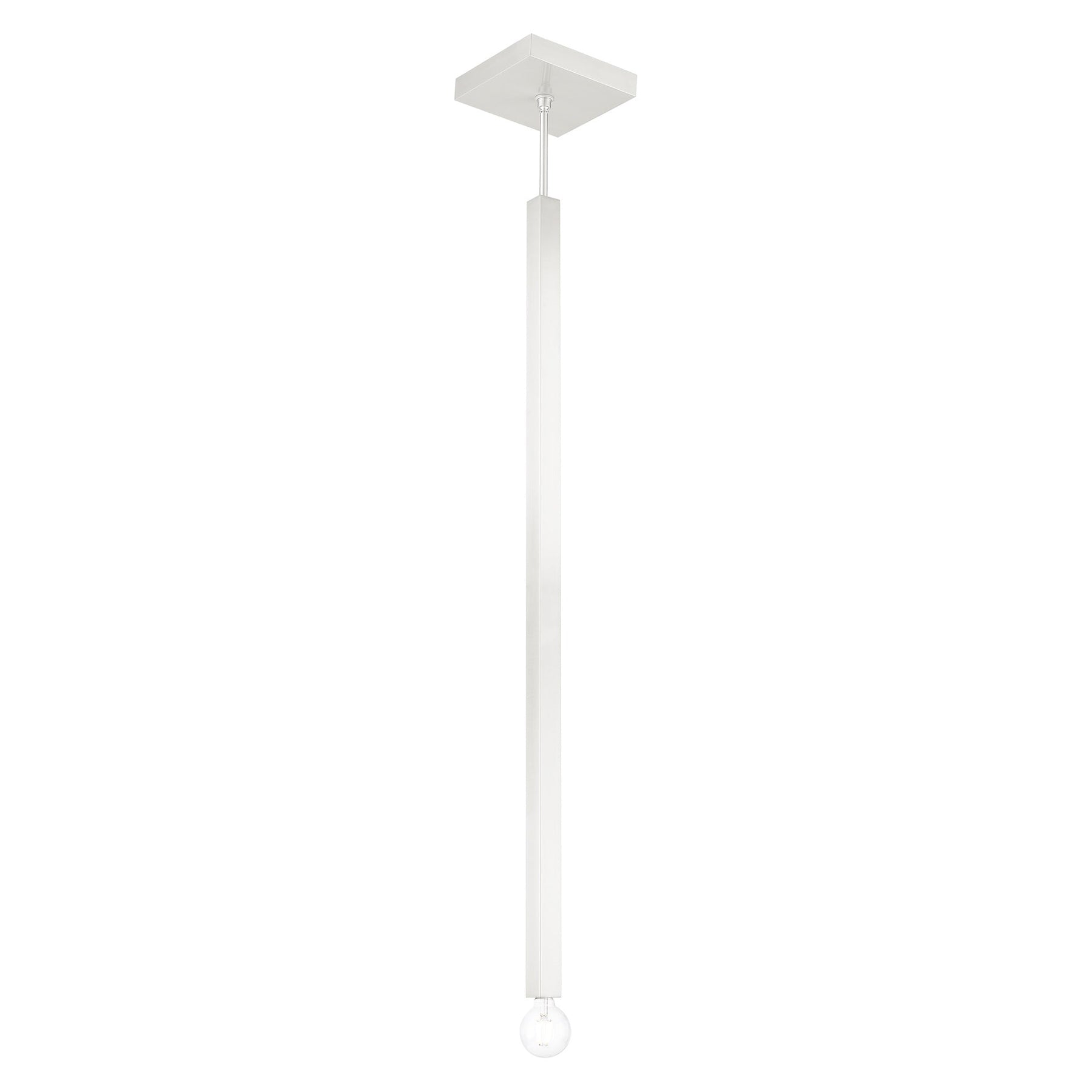 The Solna Pendant in Brushed Nickel combines minimalist design with modern elegance. This large pendant fixture features a sleek stainless steel square tube and accommodates one medium base bulb (not included) with a maximum wattage of 60W. It has an adjustable height ranging from 56 to 92 inches and a canopy size of 8.5 inches square by 1.5 inches high. Designed for damp locations, it includes six stem sections of varying lengths to fit sloped ceilings, making it an ideal choice for various settings while adding a contemporary touch to your decor.