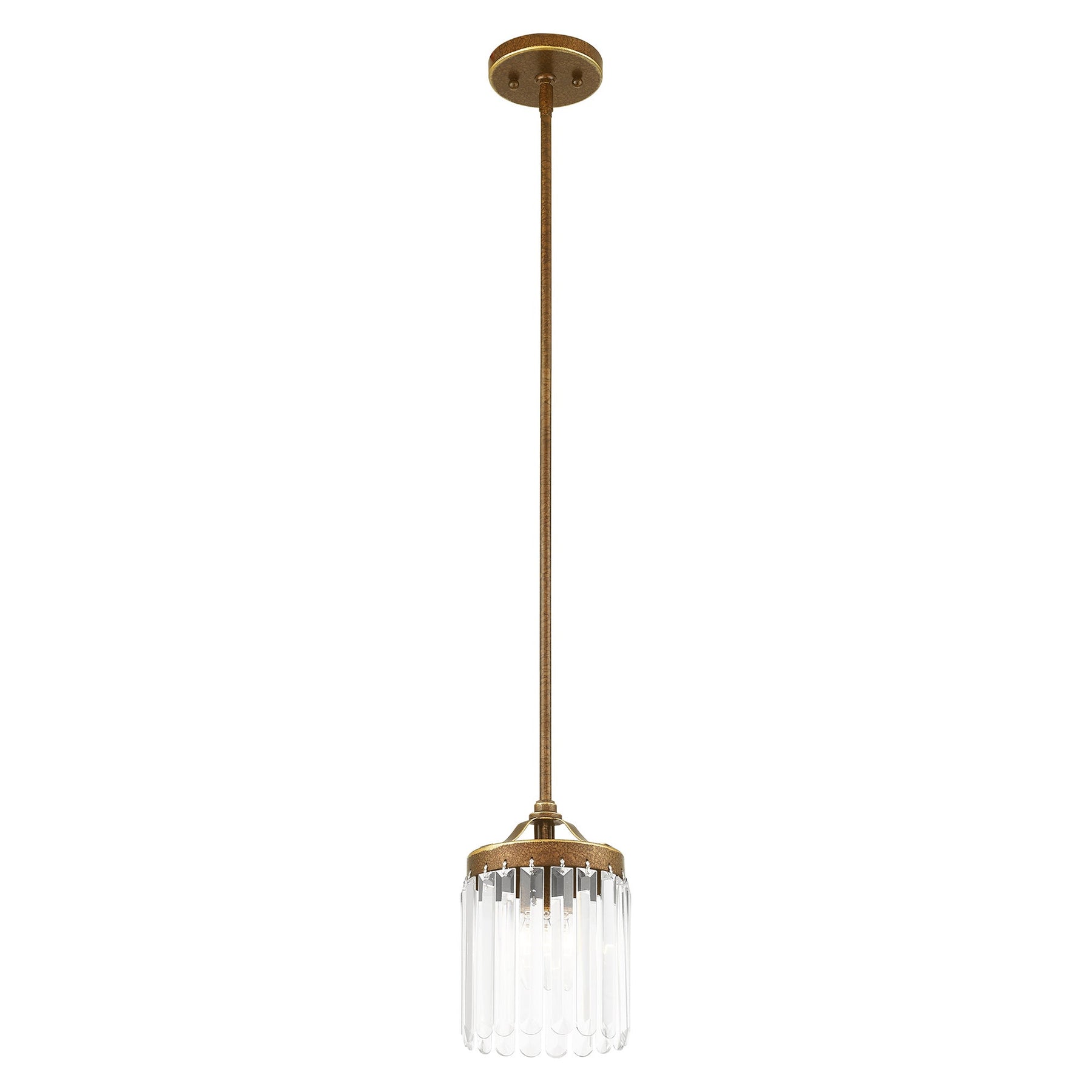 The Ashton mini pendant, item number 50530-64, embodies the charm of the 1920s with a sophisticated touch perfect for transitional spaces. This exquisite fixture features a clear prismatic crystal shade and is finished in hand-applied Palacial Bronze. Measuring 11.75 inches to 47.75 inches in height and 6.25 inches in diameter, it accommodates one candelabra base bulb (not included) with a maximum wattage of 60W. Designed with an 8-foot wire and includes stem sections of 6, 12, and 18 inches, this pendant is ideal for sloped ceilings and is suitable for damp locations.