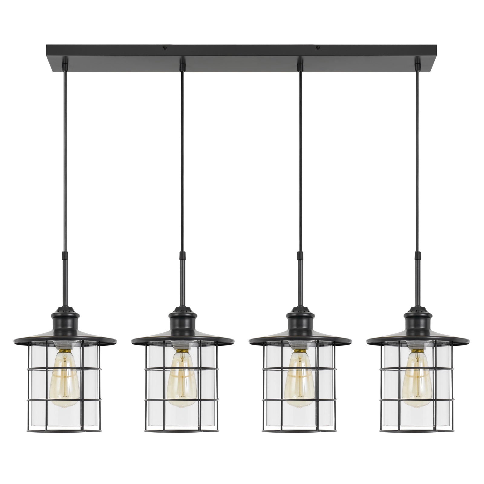 The FX-2668-4P Silverton metal/glass pendant fixture is an exquisite addition to any industrial-themed space. This versatile pendant light comes with four 60W Edison bulbs included, providing ample illumination. It features a customizable 72-inch cord and a striking cage design with a clear glass lantern shade. The fixture includes a 4 light linear canopy, ensuring easy installation. With minor assembly required, this product combines durability with style, backed by a one-year warranty against defects in material and workmanship.