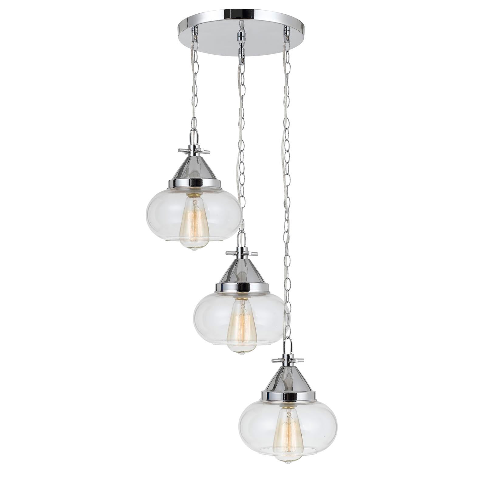The Maywood Glass Pendant, product No. FX-3624-3P, offers a modern touch to any space with its sleek chrome finish and durable glass construction. This pendant light supports three E26 bulbs (not included) with a maximum wattage of 60W each. It features a height of 10 inches and comes with a generous 10 feet of wire and a 6-foot chain, allowing for flexible installation options. Ships in one carton and requires little to no assembly. This pendant is backed by a one-year warranty for added peace of mind.