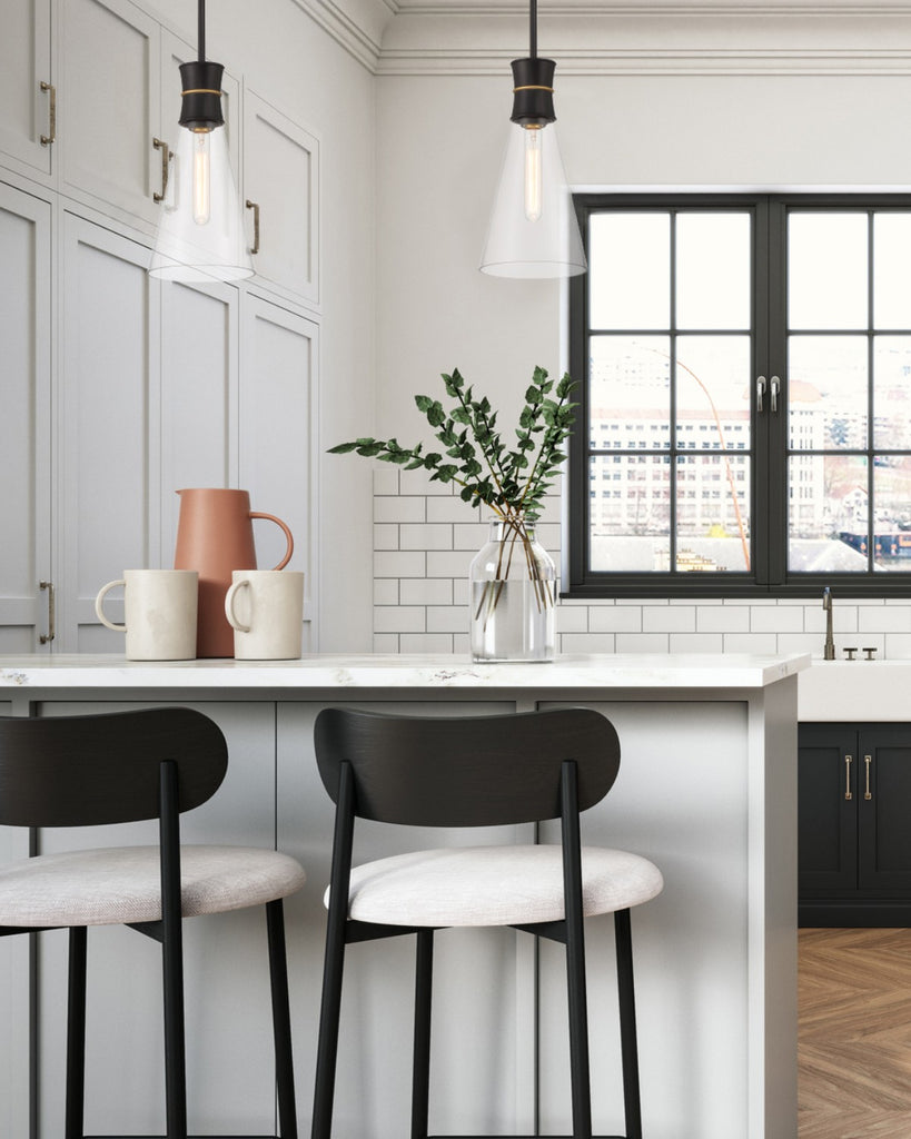 The Quinn Collection is a bold, modern statement piece that combines form and function effortlessly. With its striking two-tone finish, it immediately catches the eye. Its transparent glass cone shade is a stunning focal point, allowing a single bulb to disperse warm and inviting light, creating a welcoming and chic atmosphere. (Bulb not included.)