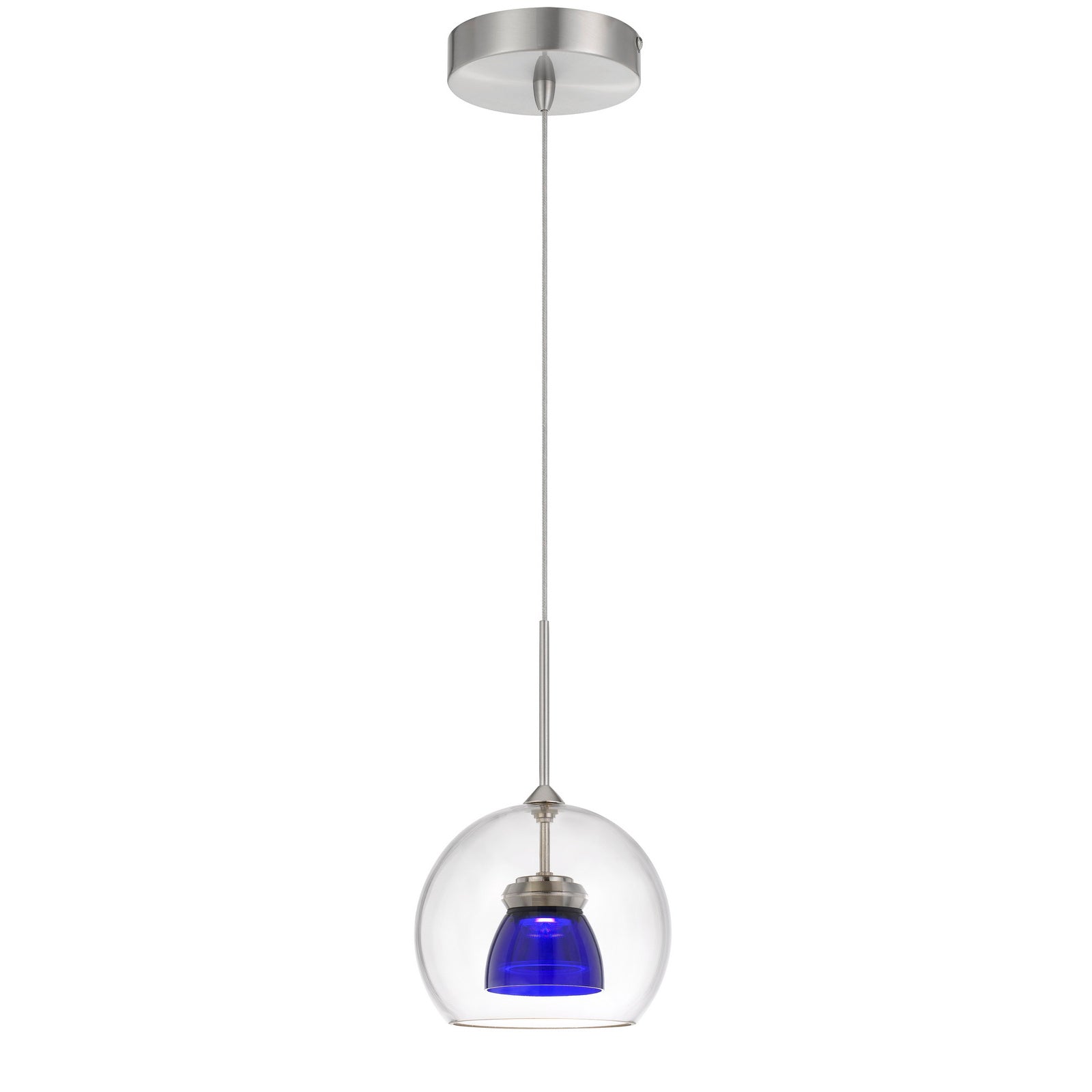 The UP-335-CL-BLUCL Integrated Dimmable LED Glass Mini Pendant Light is a stylish and versatile lighting fixture perfect for adding a pop of color to any space. With a power output of 6W and an impressive brightness of 450 lumens at a warm 3000K color temperature, this pendant light ensures effective illumination. Its durable construction features a unique double-shaded design with a glass outer shade and polycarbonate inner shade, making it both aesthetically pleasing and long-lasting. The light is also dimmable and is compatible with several Lutron Brand Dimmers. The product includes a canopy, a replaceable driver, and comes with a three-year warranty, ensuring peace of mind with your purchase.