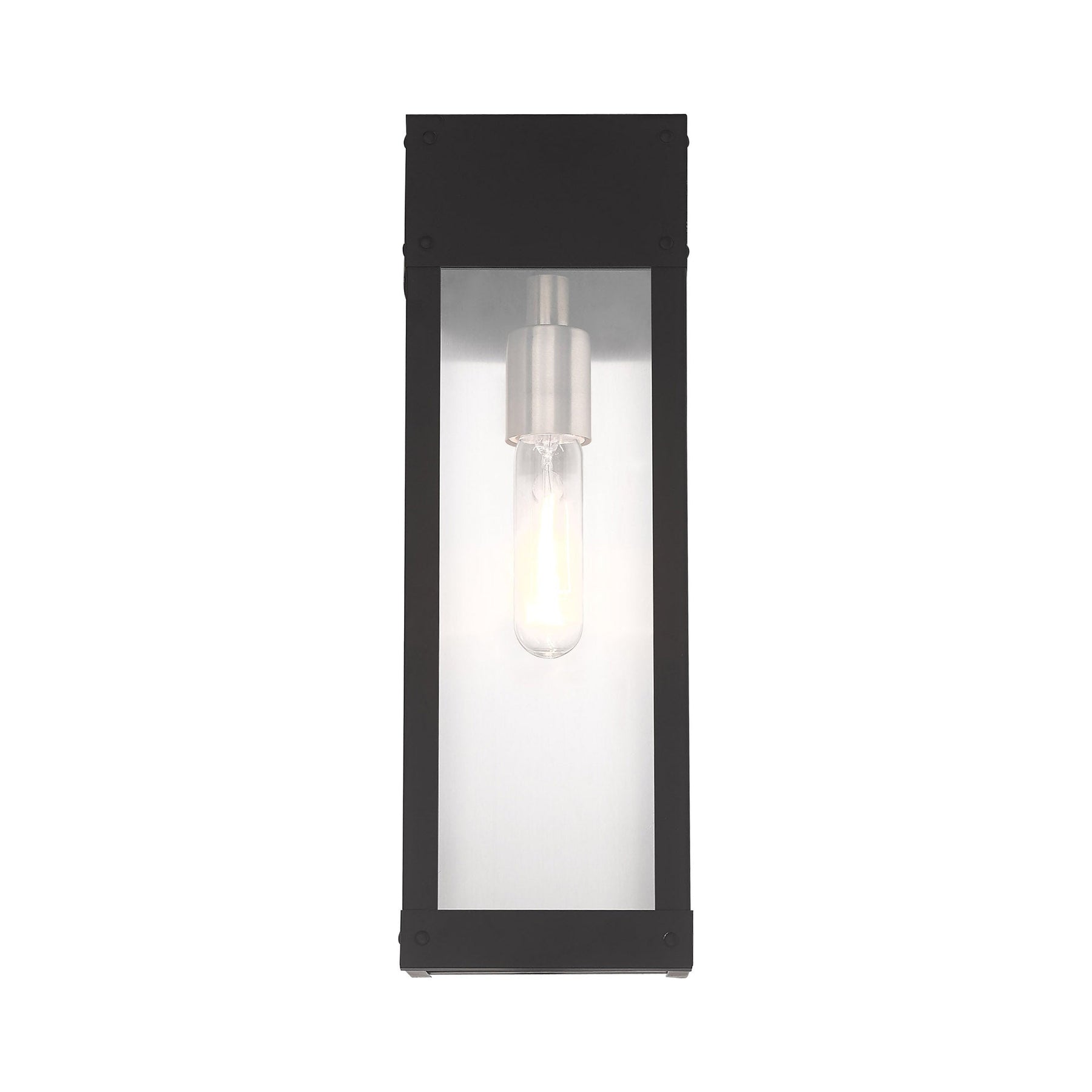 The 20873-04 Barrett Outdoor Wall Lantern, made of durable stainless steel, features a sophisticated black finish that complements a variety of outdoor decor styles. This lantern measures 5 inches in width and 15 inches in height, with a 5-inch extension from the wall. It requires one medium base bulb (not included) with a maximum wattage of 100W. The clear glass shade adds an elegant touch, allowing for vibrant illumination, while the handcrafted design ensures a unique aesthetic. Rated for both damp and wet locations, this contemporary fixture is perfect for illuminating entryways, patios, and other outdoor spaces.