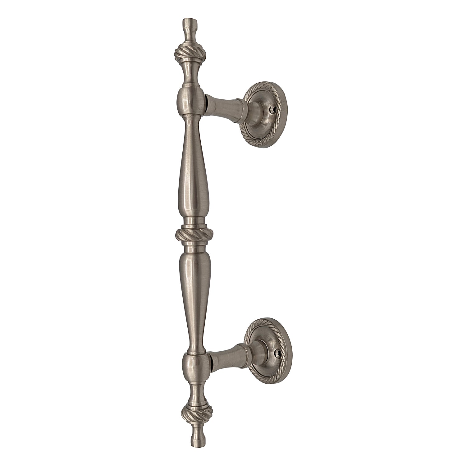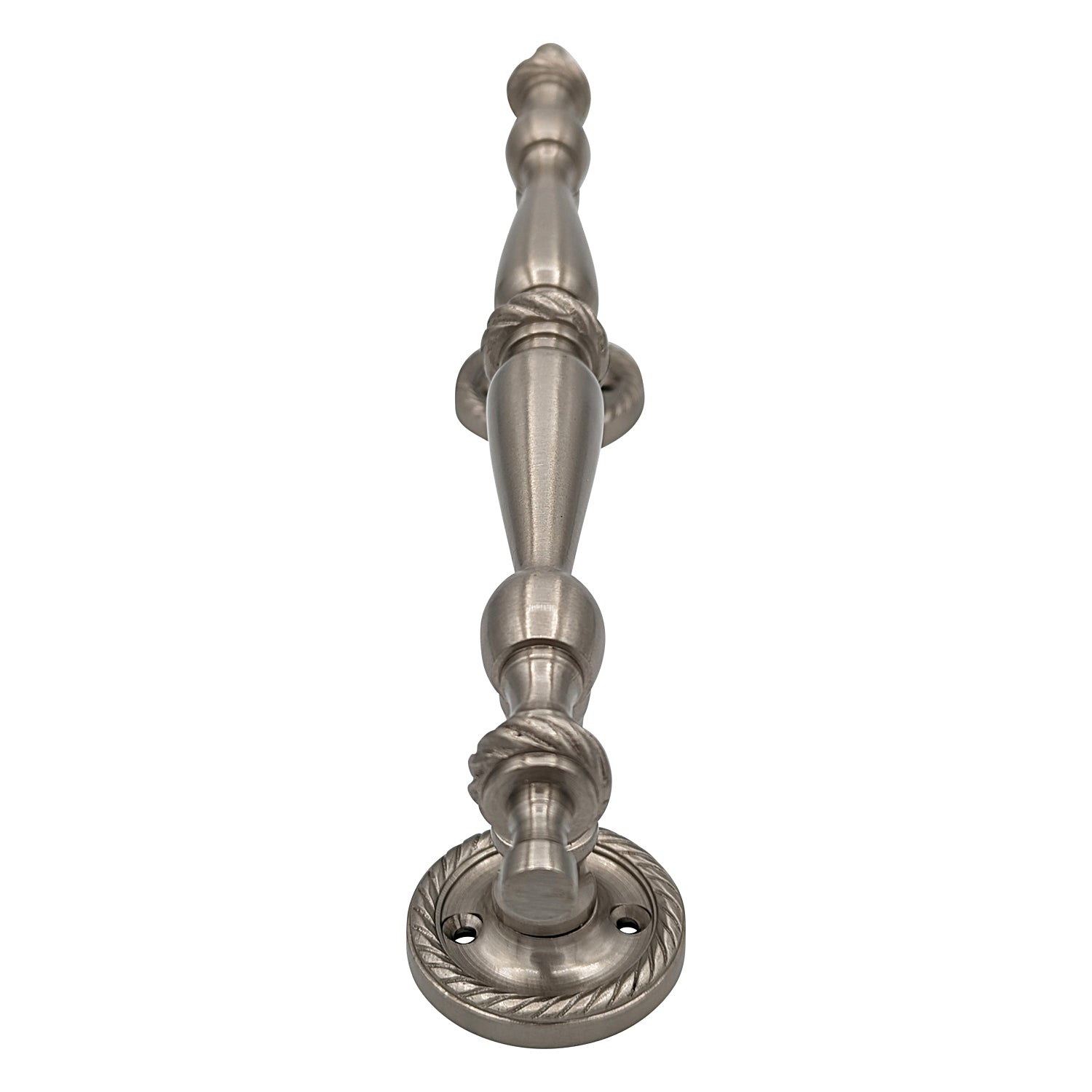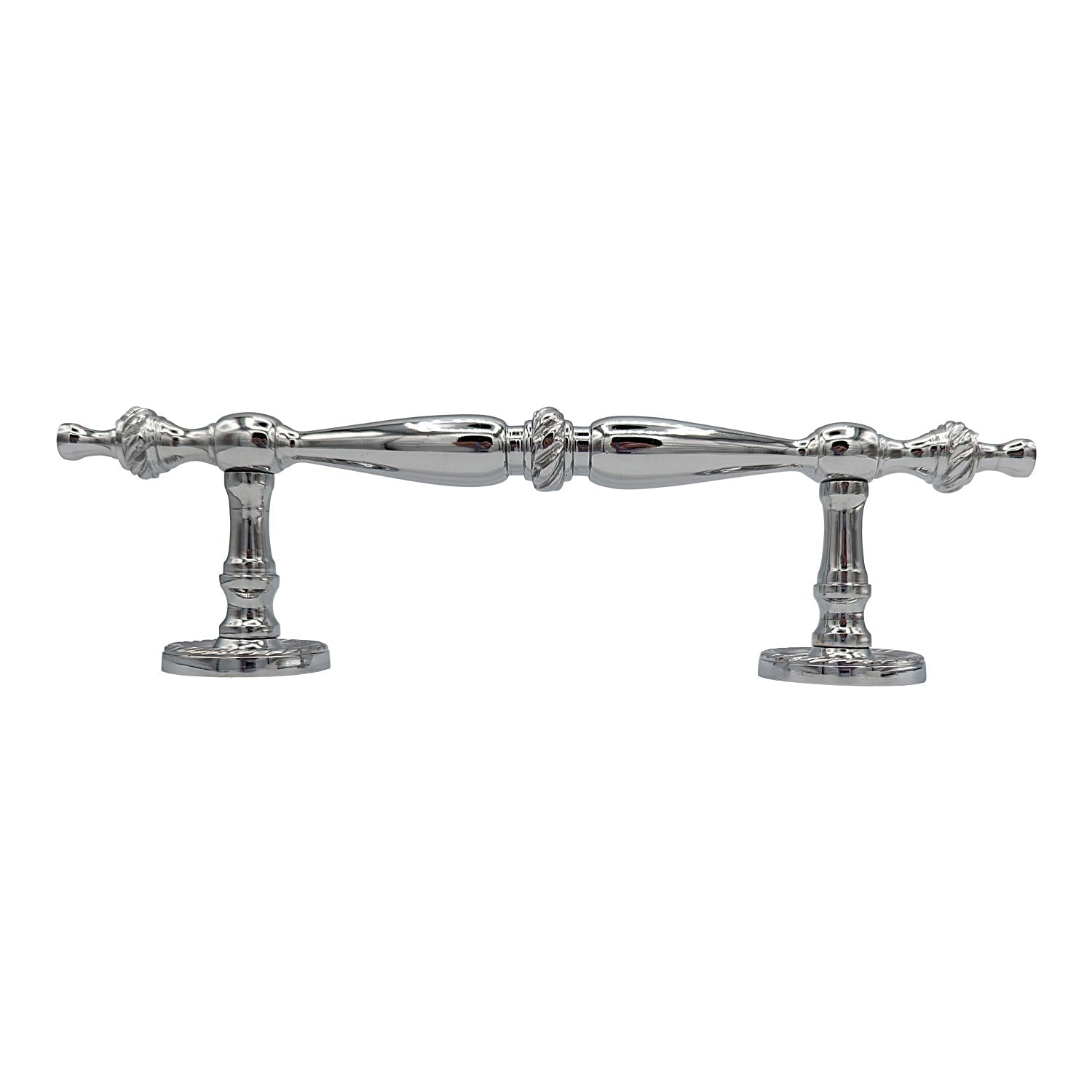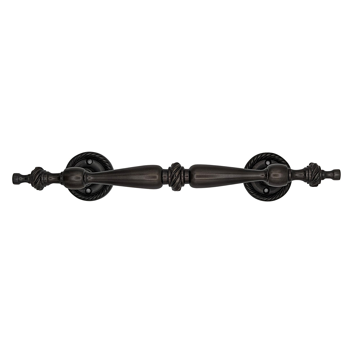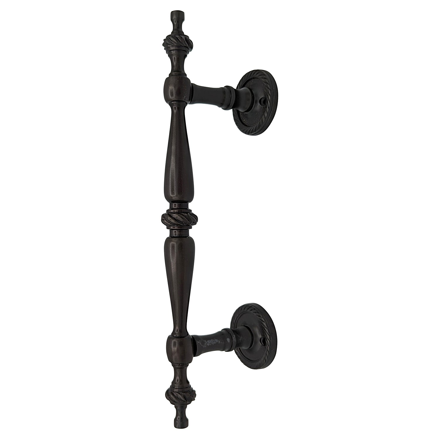 This handle has solid brass construction. It measures approximately 9 1/2 Inches long (245 mm) by 1 3/4 Inches Wide (44 mm) with a projection of 2 1/2 inches. The center to center mounting distance is approximately 6 inches.