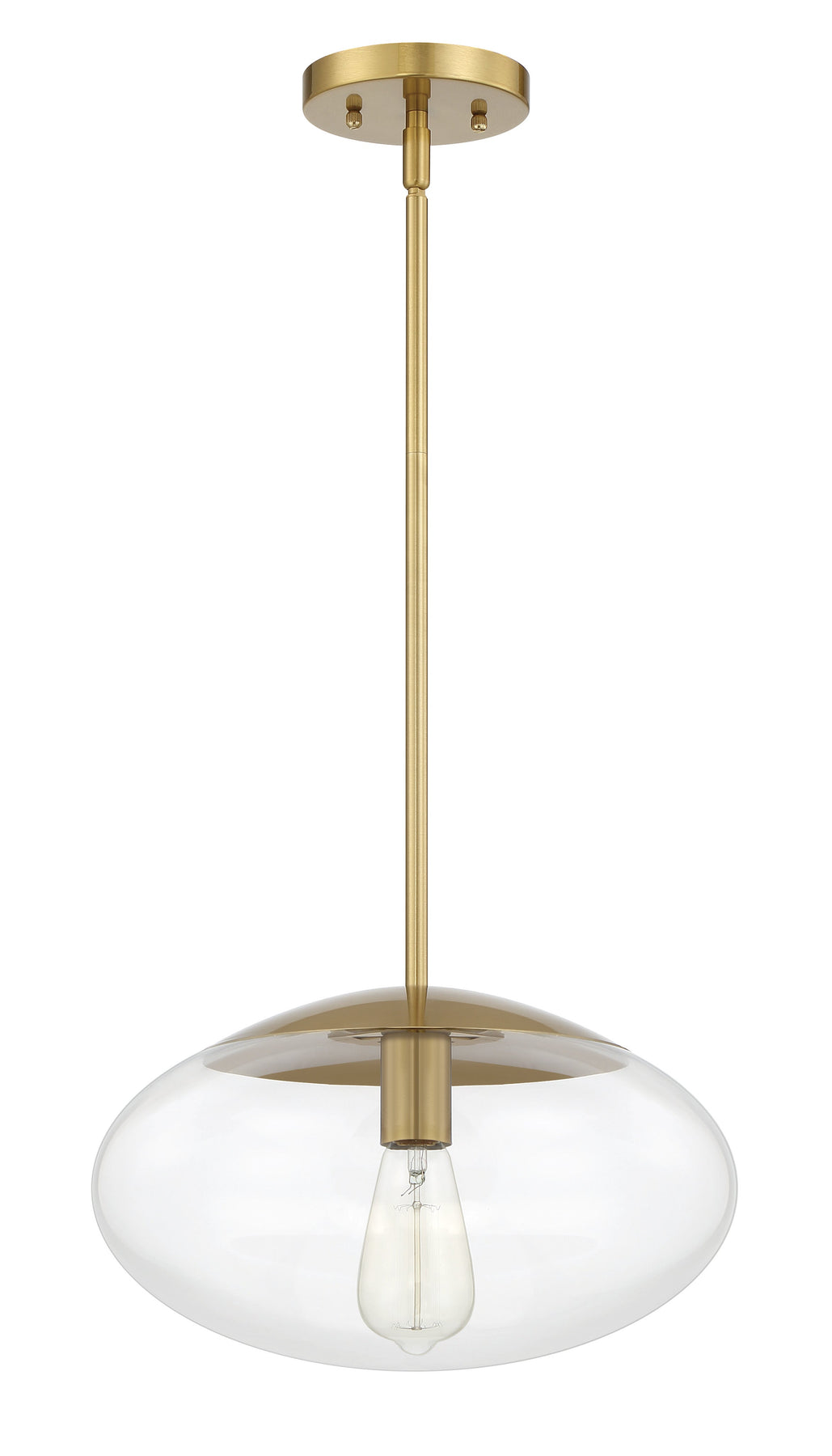 The Gaze 1 Light Pendant in Satin Brass is a sophisticated addition to any indoor space, combining elegance with functionality. This pendant features a striking clear glass globe, suspended from a versatile downrod system that includes three 12-inch and one 6-inch downrods for adjustable height. It requires a single E26 medium base bulb with a maximum wattage of 60W (not included) and is designed for indoor use only. The fixture measures 14 inches in depth and width, with a height of 8 inches, while the canopy is 5 inches in width and has a height of 0.79 inches. With its timeless design and durable construction, the Gaze pendant is an ideal lighting choice for a variety of home settings.
