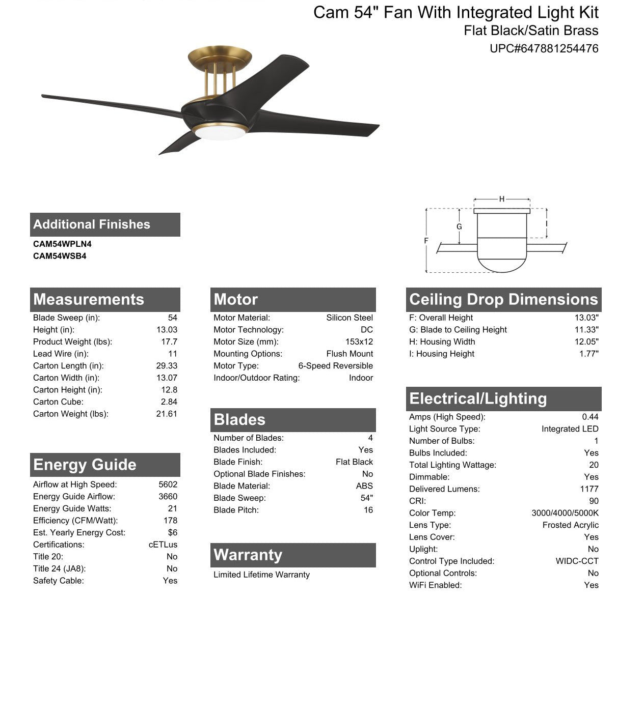 Low ceiling? No Problem! Part of our Low Ceiling Solutions Series, the Cam 54" updated flushmount ceiling fan offers smooth lines and a low-profile body with four sleek blades, an integrated 20W dimmable LED 3 CCT 3000-5000K light with optional lens cover, and is easily controlled with either the included remote control or the integrated WIFI featuring breeze and timer functions compatible for use with most smart home devices, smart phones and systems.