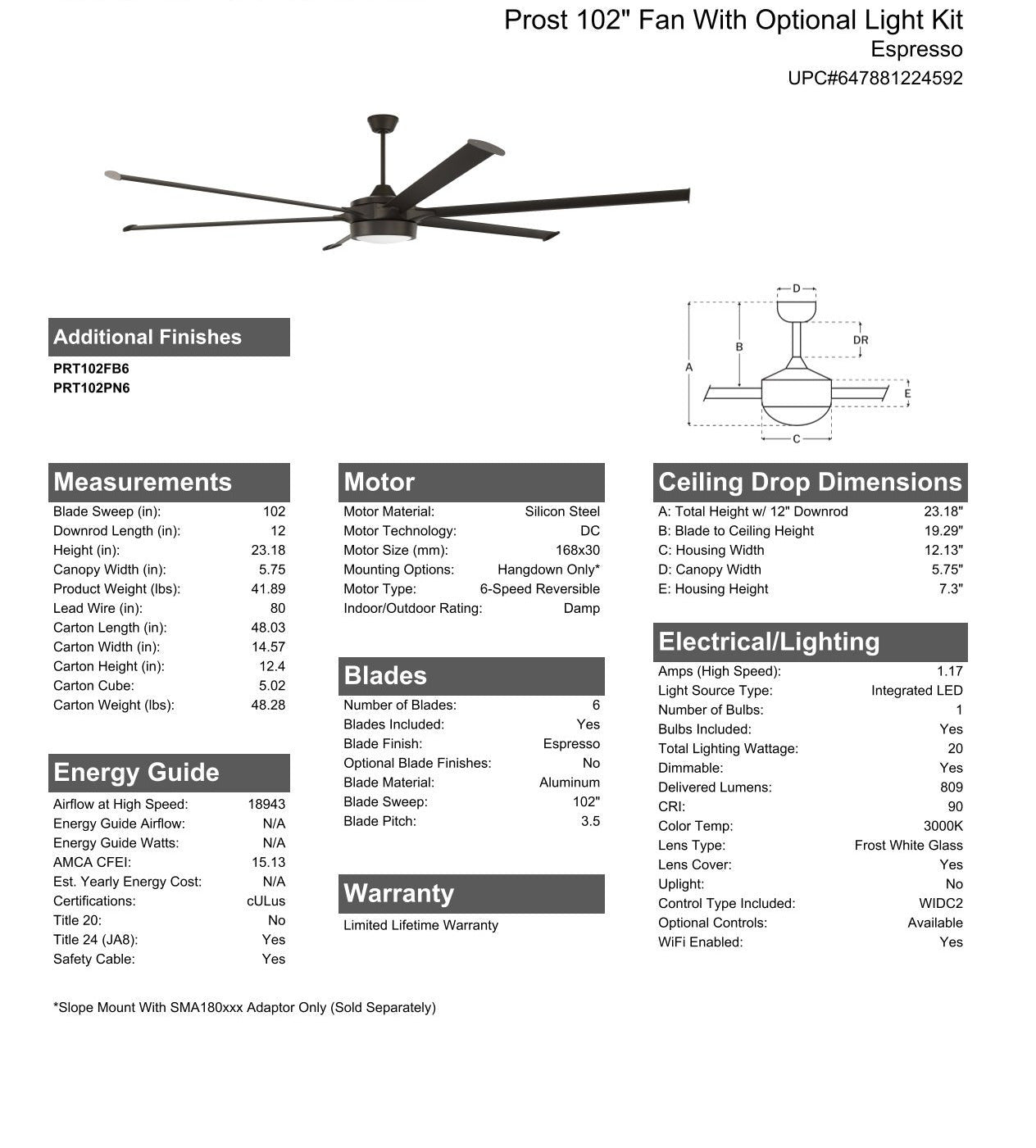 With the Prost 102" ceiling fan from Craftmade, there is a lot to celebrate! Designed to stand out and deliver maximum airflow, the indoor/outdoor damp rated Craftmade Prost 102" ceiling fan with its six custom blades features a quiet energy saving 6-speed, reversible DC motor, integrated 20W dimmable LED light with optional lens cover and is easily controlled with either the included remote control or the integrated Wi-Fi featuring breeze and timer functions compatible for use with most smart home devices, smart phones and systems.